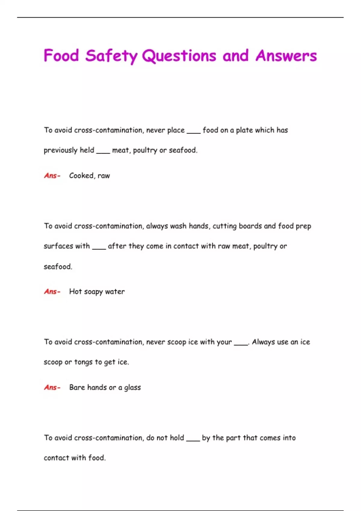 To avoid cross-contamination, never place ___ food on a plate which has previously held ___ meat, poultry or seafood. Ans- Cooked, raw To avoid cross-contamination, always wash hands, cutting boards and food prep surfaces with ___ after they come in contact with raw meat, poultry or seafood. Ans- Hot soapy water To avoid cross-contamination, never scoop ice with your ___. Always use an ice scoop or tongs to get ice. Ans- Bare hands or a glass To avoid cross-contamination, do not hold ___ by the part that comes into contact with food. Ans- Utensils To avoid cross-contamination, use ___ to serve ready-to-eat foods like bagels. Ans- Tongs, gloves, deli-sheets To avoid cross-contamination, change ___ after handling raw meat, poultry and seafood. Ans- Gloves To avoid cross-contamination, always change gloves after they get ___. Ans- Dirty or tor