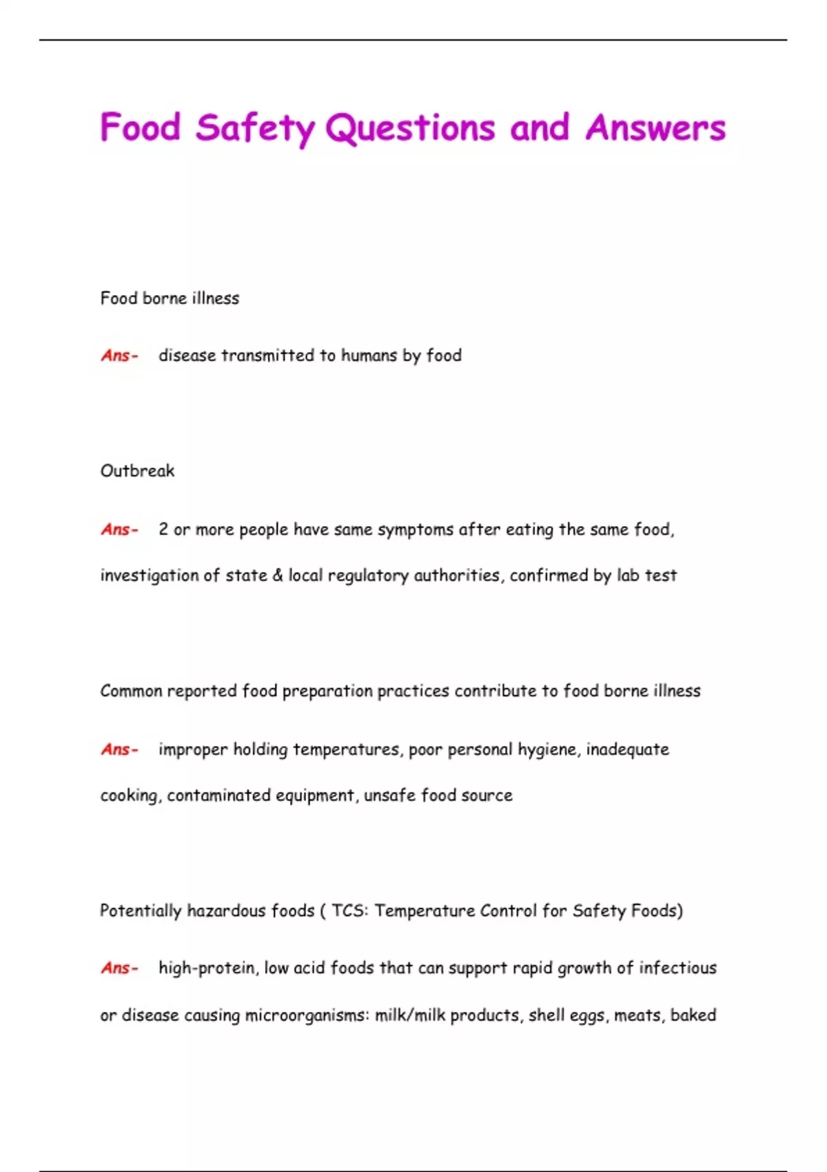 Food borne illness Ans- disease transmitted to humans by food Outbreak Ans- 2 or more people have same symptoms after eating the same food, investigation of state & local regulatory authorities, confirmed by lab test Common reported food preparation practices contribute to food borne illness Ans- improper holding temperatures, poor personal hygiene, inadequate cooking, contaminated equipment, unsafe food source Potentially hazardous foods ( TCS: Temperature Control for Safety Foods) Ans- high-protein, low acid foods that can support rapid growth of infectious or disease causing microorganisms: milk/milk products, shell eggs, meats, baked or boiled potatoes, tofu/soy products, raw seed sprouts (alfalfa or bean sprouts) Challenges to food safety Ans- time & money to train employees, language & culture barriers of employees, literacy/education level of employees, pathogens found more frequent & getting stronger, unapproved suppliers, high-risk customers (elderly, pre-school age, compromised immune systems), high staff turnover (hire & train) Costs $ to food borne illness Ans- human life, loss work, medical/disability, media exposure, loss reputation/legal fee, insurance premiums go up High Risk Consumers