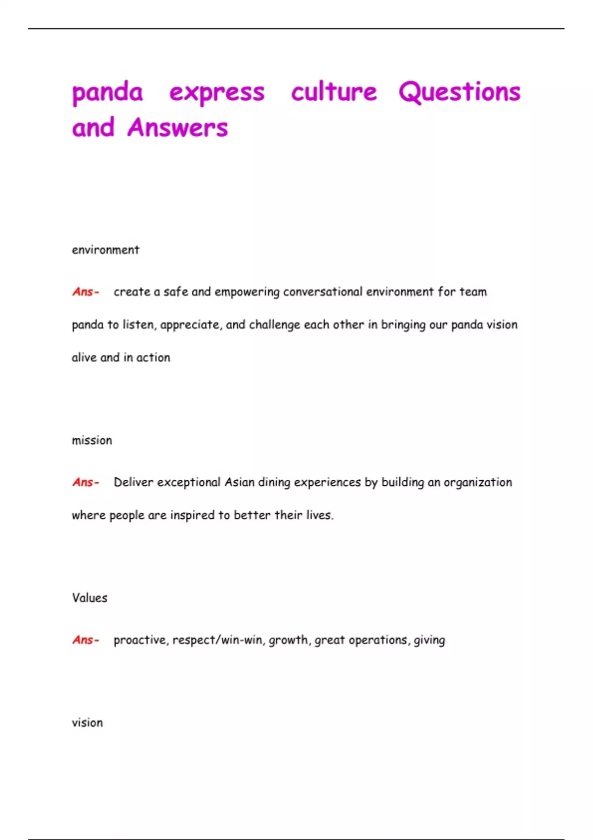 environment Ans- create a safe and empowering conversational environment for team panda to listen, appreciate, and challenge each other in bringing our panda vision alive and in action mission Ans- Deliver exceptional Asian dining experiences by building an organization where people are inspired to better their lives. Values Ans- proactive, respect/win-win, growth, great operations, giving vision Ans- Be recognized as a world leader in people development to become loved by our guests the panda way Ans- Healthy Life style, Continuous Learning, Developing Others, Acknowledging others workability Ans- Be capable of always delivering exceptional results with high standards and great attitude Intensity Ans- Be all in for the highest engagement and execution. Now! integrit