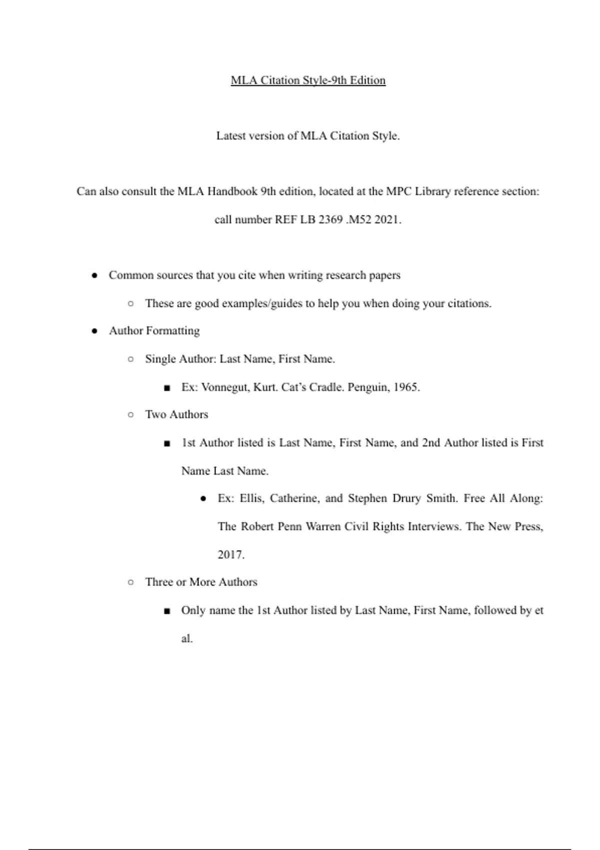 9th Edition MLA Works Cited for Introduction to Library and Research Skills (LIBR 50)