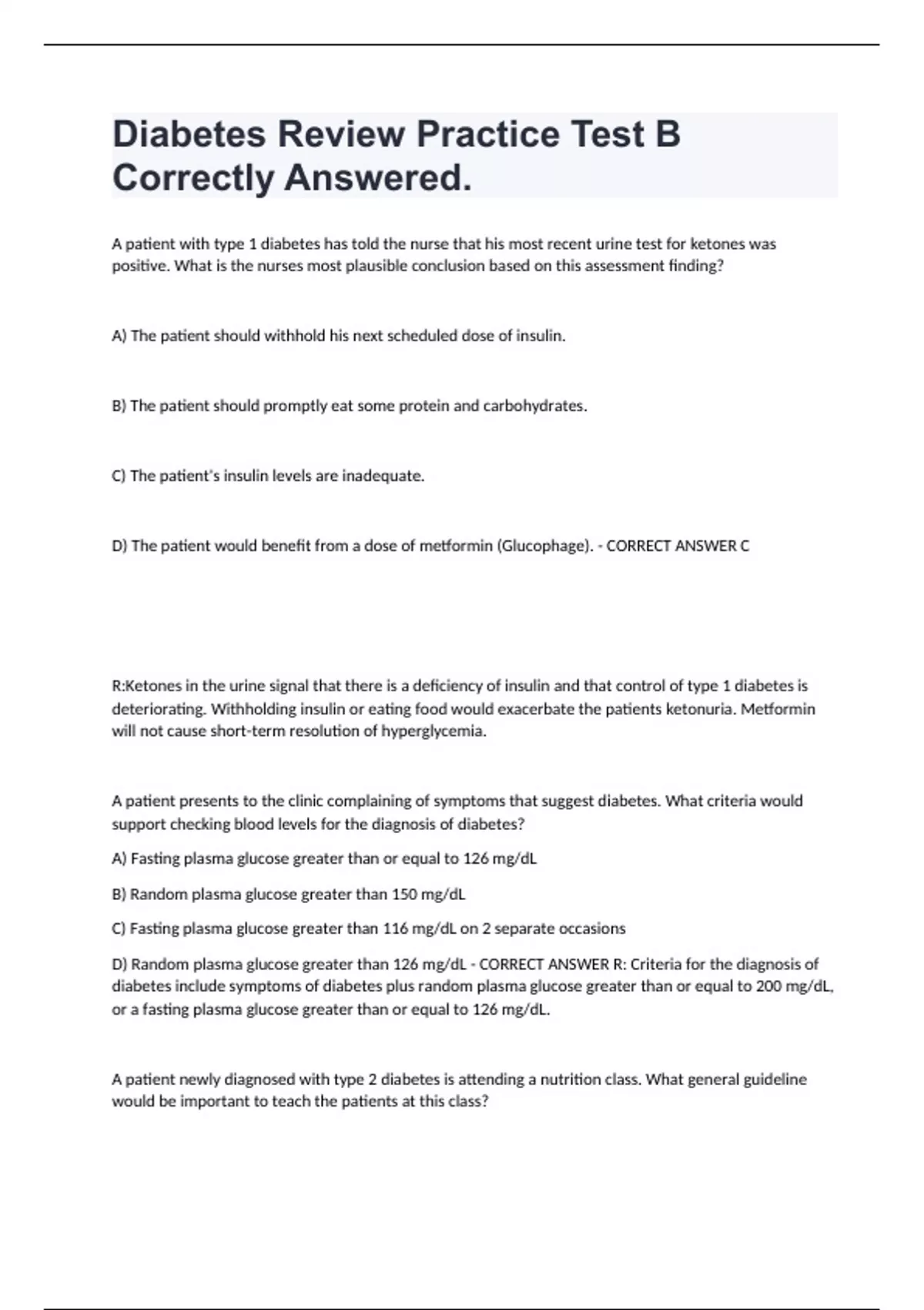 Diabetes Review Practice Test B Correctly Answered. A patient with type 1 diabetes has told the nurse that his most recent urine test for ketones was positive. What is the nurses most plausible conclusion based on this assessment finding? A) The patient should withhold his next scheduled dose of insulin. B) The patient should promptly eat some protein and carbohydrates. C) The patient's insulin levels are inadequate. D) The patient would benefit from a dose of metformin (Glucophage). - CORRECT ANSWER C R:Ketones in the urine signal that there is a deficiency of insulin and that control of type 1 diabetes is deteriorating. Withholding insulin or eating food would exacerbate the patients ketonuria. Metformin will not cause short-term resolution of hyperglycemia. A patient presents to the clinic complaining of symptoms that suggest diabetes. What criteria would support checking blood levels for the diagnosis of diabetes? A) Fasting plasma glucose greater than or equal to 126 mg/dL B) Random plasma glucose greater than 150 mg/dL C) Fasting plasma glucose greater than 116 mg/dL on 2 separate occasions D) Random plasma glucose greater than 126 mg/dL - CORRECT ANSWER R: Criteria for the diagnosis of diabetes include symptoms of diabetes plus random plasma glucose greater than or equal to 200 mg/dL, or a fasting plasma glucose greater than or equal to 126 mg/dL. A patient newly diagnosed with type 2 diabetes is attending a nutrition class. What general guideline would be important to teach the patients at this class? A) Low fat generally indicates low sugar. B) Protein should constitute 30% to 40% of caloric intake. C) Most calories should be derived from carbohydrates. D) Animal fats should be eliminated from the diet. - CORRECT ANSWER C R: Currently, the ADA and the Academy of Nutrition and Dietetics (formerly the American Dietetic Association) recommend that for all levels of caloric intake, 50% to 60% of calories should be derived from carbohydrates, 20% to 30% from fat, and the remaining 10% to 20% from protein.Low fat does not automatically mean low sugar. Dietary animal fat does not need to be eliminated from the diet. A nurse is providing health education to an adolescent newly diagnosed with type 1 diabetes mellitus and her family. The nurse teaches the patient and family that which of the following nonpharmacologic measures will decrease the bodys need for insulin? A) Adequate sleep B) Low stimulation C) Exercise D) Low-fat diet - CORRECT ANSWER C