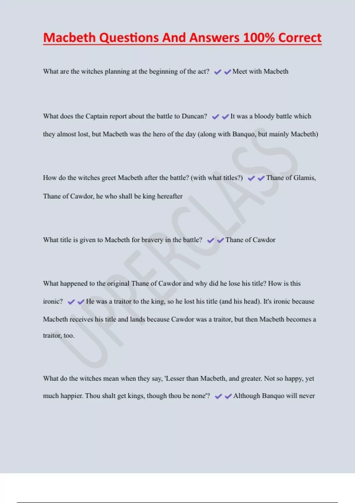 Macbeth Questions And Answers 100% Correct What are the witches planning at the beginning of the act? Meet with Macbeth What does the Captain report about the battle to Duncan? It was a bloody battle which they almost lost, but Macbeth was the hero of the day (along with Banquo, but mainly Macbeth) How do the witches greet Macbeth after the battle? (with what titles?) Thane of Glamis, Thane of Cawdor, he who shall be king hereafter What title is given to Macbeth for bravery in the battle? Thane of Cawdor What happened to the original Thane of Cawdor and why did he lose his title? How is this ironic? He was a traitor to the king, so he lost his title (and his head). It's ironic because Macbeth receives his title and lands because Cawdor was a traitor, but then Macbeth becomes a traitor, too.