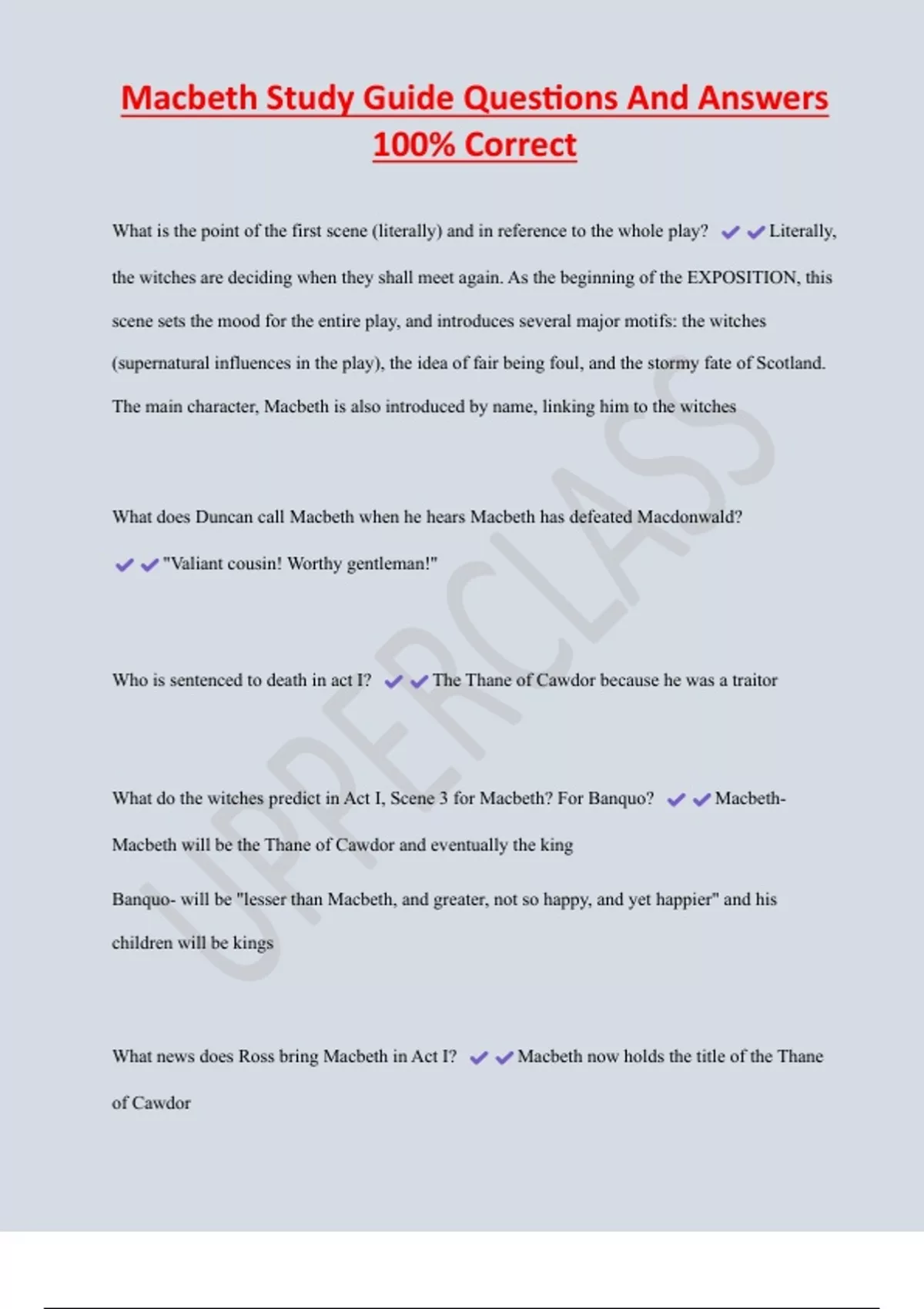 Macbeth Study Guide Questions And Answers 100% Correct What is the point of the first scene (literally) and in reference to the whole play? Literally, the witches are deciding when they shall meet again. As the beginning of the EXPOSITION, this scene sets the mood for the entire play, and introduces several major motifs: the witches (supernatural influences in the play), the idea of fair being foul, and the stormy fate of Scotland. The main character, Macbeth is also introduced by name, linking him to the witches What does Duncan call Macbeth when he hears Macbeth has defeated Macdonwald? "Valiant cousin! Worthy gentleman!" Who is sentenced to death in act I? The Thane of Cawdor because he was a traitor What do the witches predict in Act I, Scene 3 for Macbeth? For Banquo? MacbethMacbeth will be the Thane of Cawdor and eventually the king Banquo- will be "lesser than Macbeth, and greater, not so happy, and yet happier" and his children will be kings