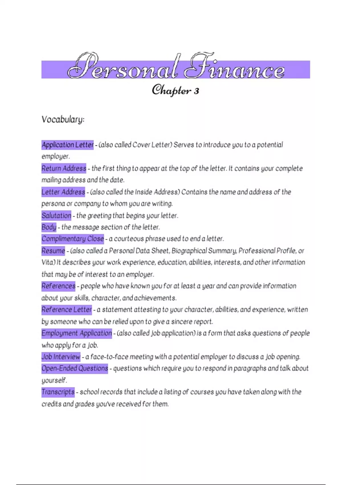 Notes and Vocabulary for High School Personal Finance class
