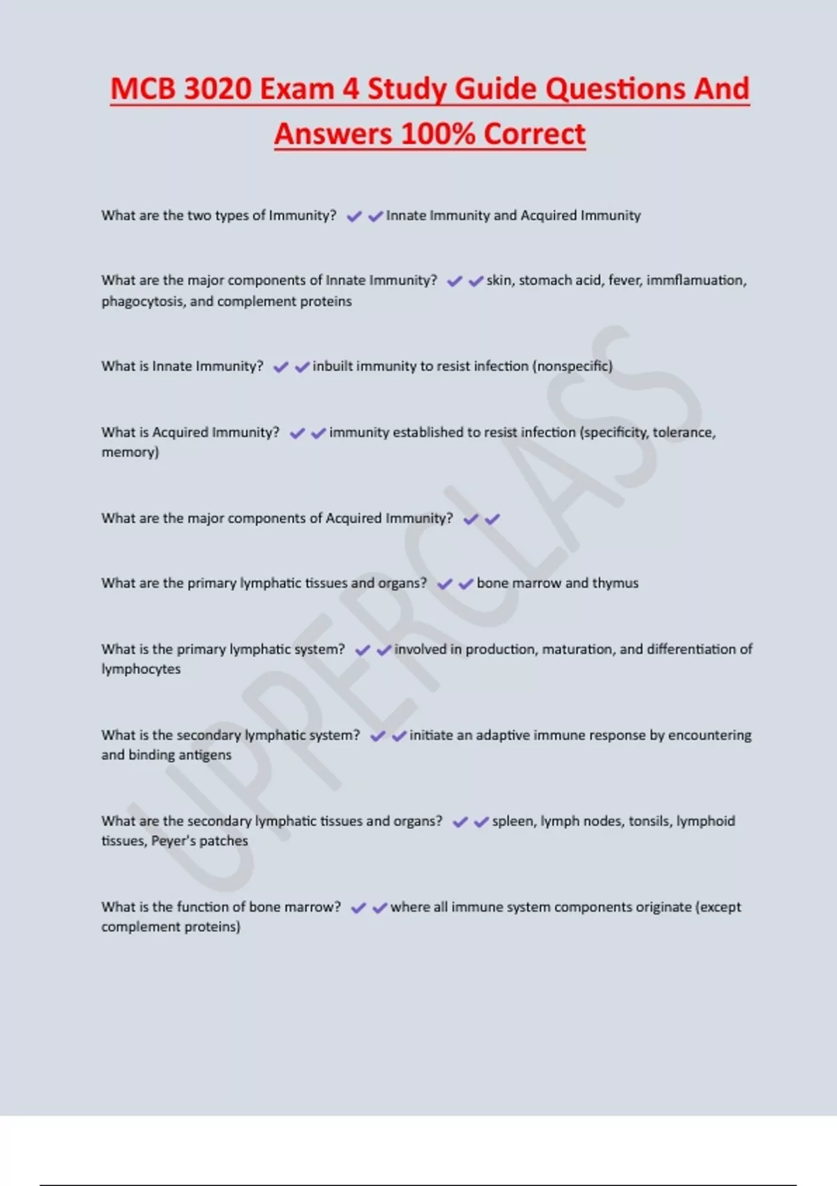 MCB 3020 Exam 4 Study Guide Questions And Answers 100% Correct What are the two types of Immunity? Innate Immunity and Acquired Immunity What are the major components of Innate Immunity? skin, stomach acid, fever, immflamuation, phagocytosis, and complement proteins What is Innate Immunity? inbuilt immunity to resist infection (nonspecific) What is Acquired Immunity? immunity established to resist infection (specificity, tolerance, memory) What are the major components of Acquired Immunity? What are the primary lymphatic tissues and organs? bone marrow and thymus What is the primary lymphatic system? involved in production, maturation, and differentiation of lymphocytes