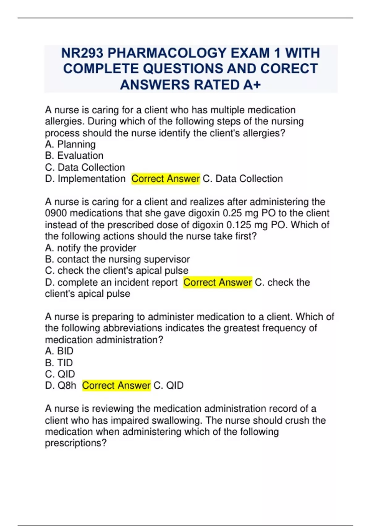 NR293 PHARMACOLOGY EXAM 1 WITH COMPLETE QUESTIONS AND CORECT ANSWERS RATED A+ A nurse is caring for a client who has multiple medication allergies. During which of the following steps of the nursing process should the nurse identify the client's allergies? A. Planning B. Evaluation C. Data Collection D. Implementation Correct Answer C. Data Collection A nurse is caring for a client and realizes after administering the 0900 medications that she gave digoxin 0.25 mg PO to the client instead of the prescribed dose of digoxin 0.125 mg PO. Which of the following actions should the nurse take first? A. notify the provider B. contact the nursing supervisor C. check the client's apical pulse D. complete an incident report Correct Answer C. check the client's apical pulse