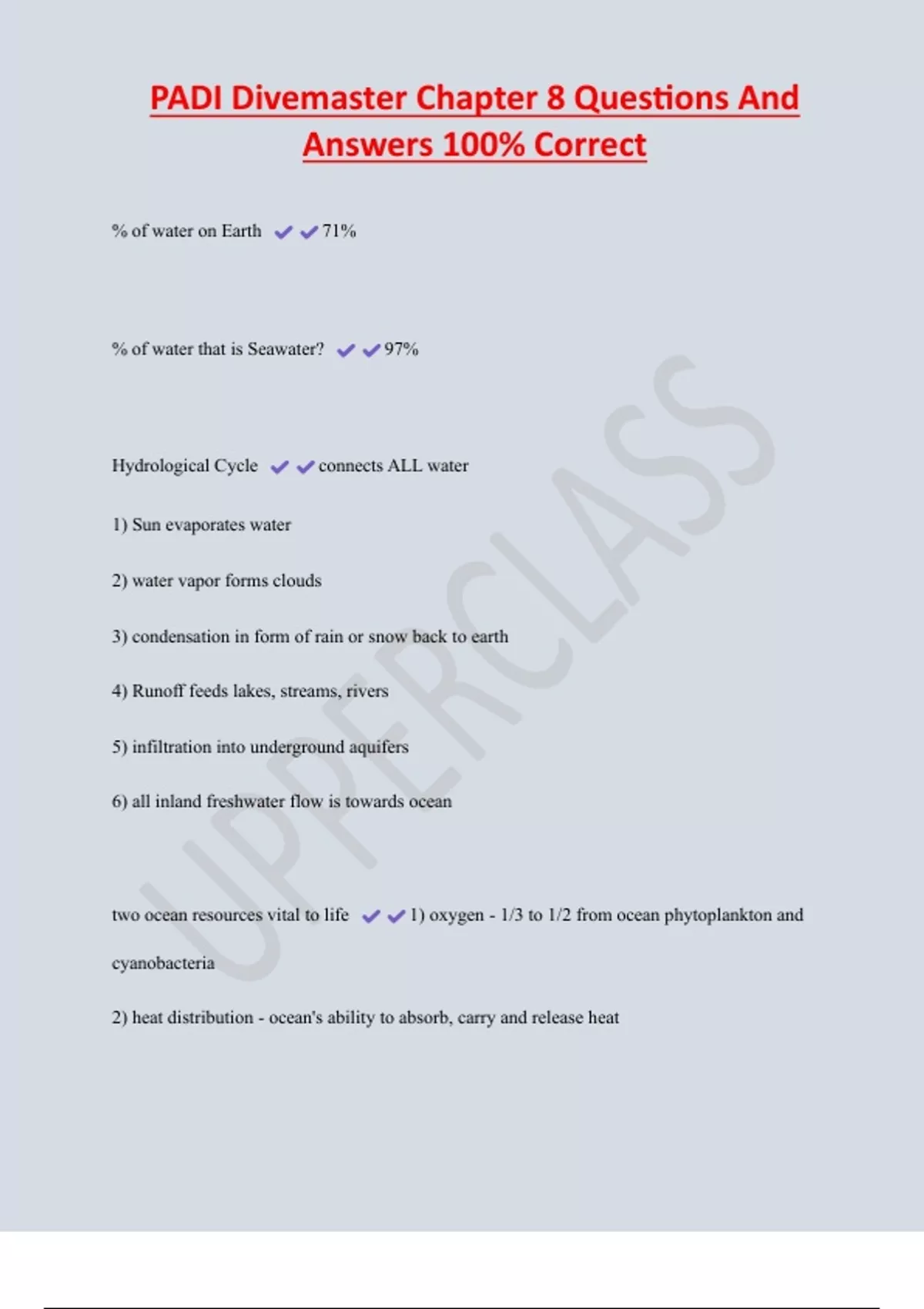 PADI Divemaster Chapter 8 Questions And Answers 100% Correct % of water on Earth 71% % of water that is Seawater? 97% Hydrological Cycle connects ALL water 1) Sun evaporates water 2) water vapor forms clouds 3) condensation in form of rain or snow back to earth 4) Runoff feeds lakes, streams, rivers 5) infiltration into underground aquifers 6) all inland freshwater flow is towards ocean