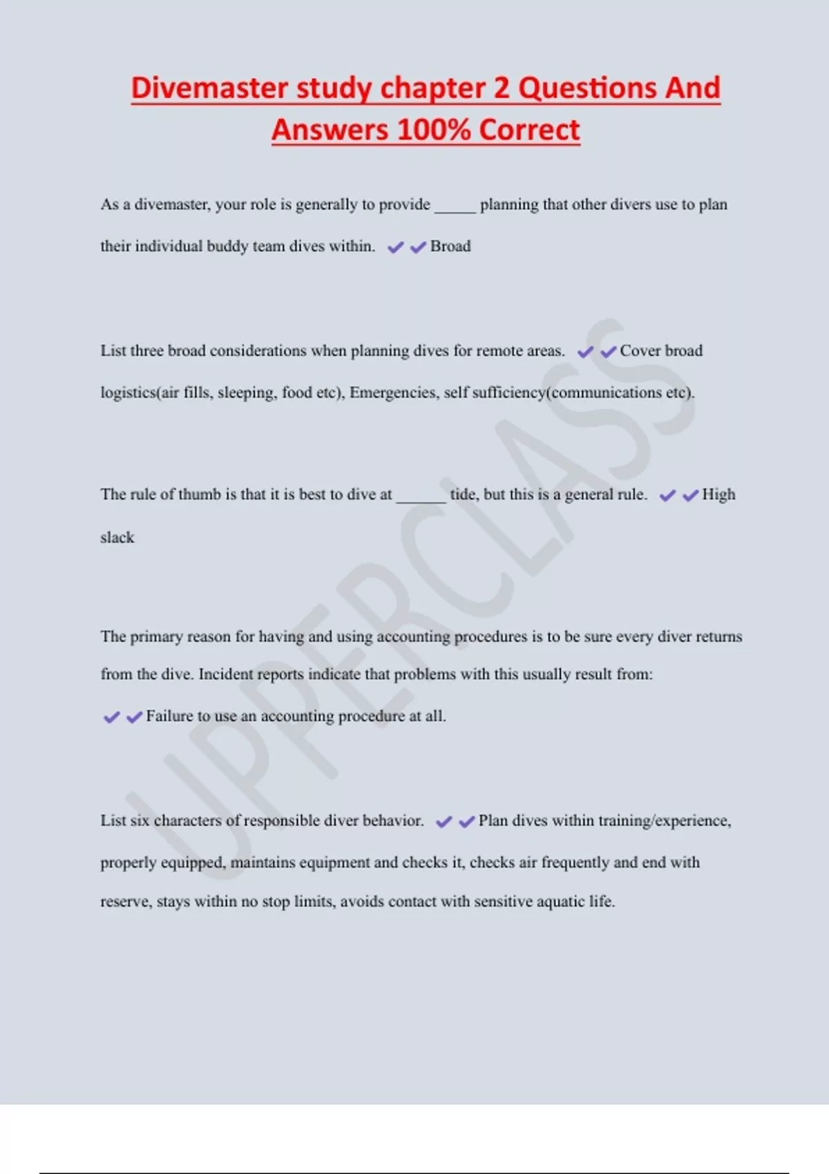 Divemaster study chapter 2 Questions And Answers 100% Correct As a divemaster, your role is generally to provide _____ planning that other divers use to plan their individual buddy team dives within. Broad List three broad considerations when planning dives for remote areas. Cover broad logistics(air fills, sleeping, food etc), Emergencies, self sufficiency(communications etc). The rule of thumb is that it is best to dive at ______ tide, but this is a general rule. High slack The primary reason for having and using accounting procedures is to be sure every diver returns from the dive. Incident reports indicate that problems with this usually result from: Failure to use an accounting procedure at all