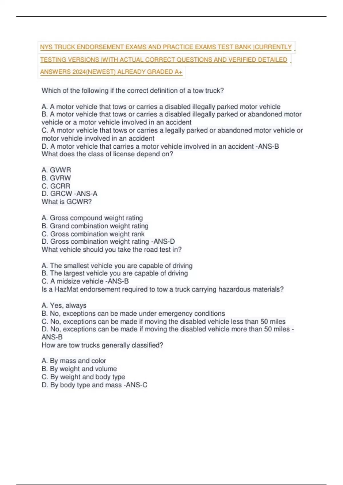 NYS TRUCK ENDORSEMENT EXAMS AND PRACTICE EXAMS TEST BANK |CURRENTLY TESTING VERSIONS |WITH ACTUAL CORRECT QUESTIONS AND VERIFIED DETAILED ANSWERS 2024(NEWEST) ALREADY GRADED A+
