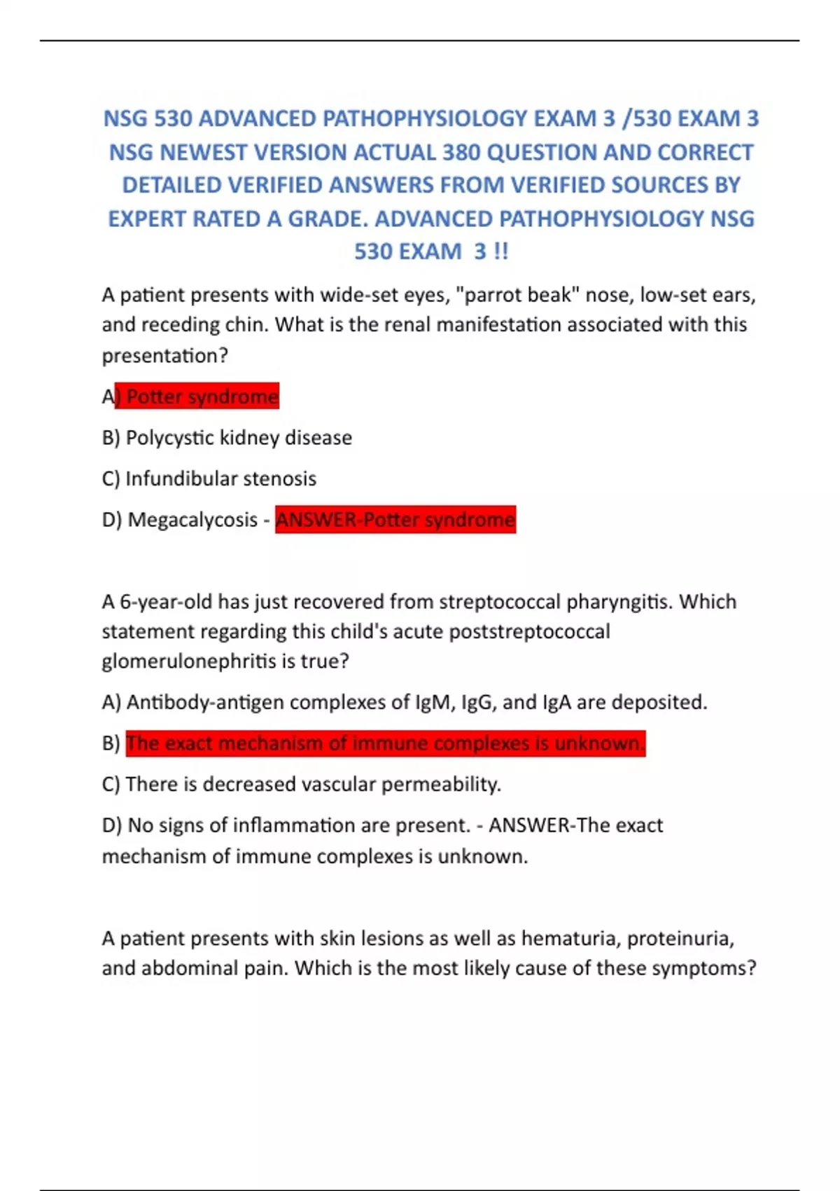 NSG 530 ADVANCED PATHOPHYSIOLOGY EXAM 3 /530 EXAM 3 NSG NEWEST VERSION ACTUAL 380 QUESTION AND CORRECT DETAILED VERIFIED ANSWERS FROM VERIFIED SOURCES BY EXPERT RATED A GRADE. ADVANCED PATHOPHYSIOLOGY NSG 530 EXAM 3 !!