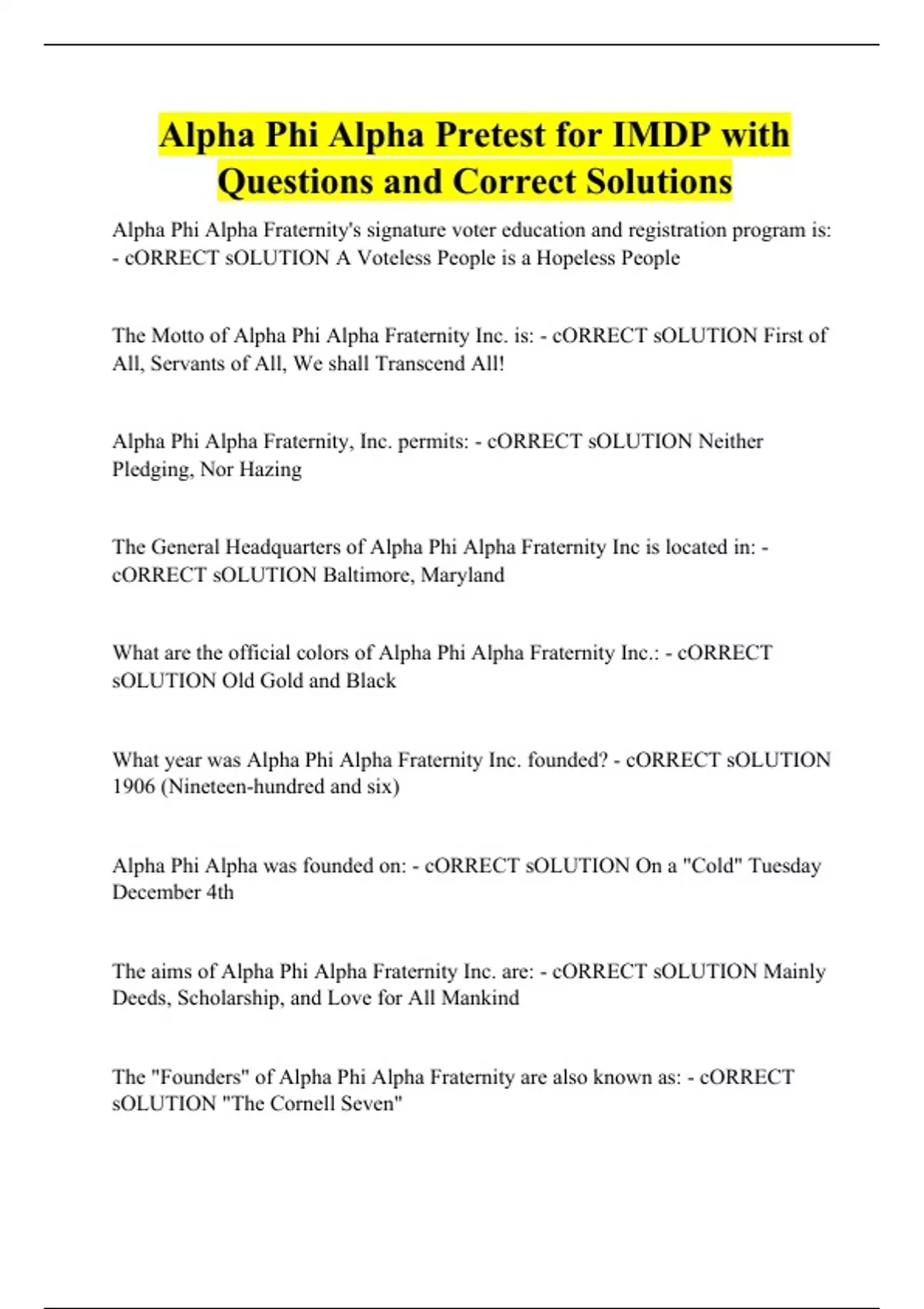 Alpha Phi Alpha Fraternity's signature voter education and registration program is: - cORRECT sOLUTION A Voteless People is a Hopeless People The Motto of Alpha Phi Alpha Fraternity Inc. is: - cORRECT sOLUTION First of All, Servants of All, We shall Transcend All! Alpha Phi Alpha Fraternity, Inc. permits: - cORRECT sOLUTION Neither Pledging, Nor Hazing The General Headquarters of Alpha Phi Alpha Fraternity Inc is located in: - cORRECT sOLUTION Baltimore, Maryland What are the official colors of Alpha Phi Alpha Fraternity Inc.: - cORRECT sOLUTION Old Gold and Black What year was Alpha Phi Alpha Fraternity Inc. founded? - cORRECT sOLUTION 1906 (Nineteen-hundred and six) Alpha Phi Alpha was founded on: - cORRECT sOLUTION On a "Cold" Tuesday December 4th The aims of Alpha Phi Alpha Fraternity Inc. are: - cORRECT sOLUTION Mainly Deeds, Scholarship, and Love for All Mankind The "Founders" of Alpha Phi Alpha Fraternity are also known as: - cORRECT sOLUTION "The Cornell Seven"