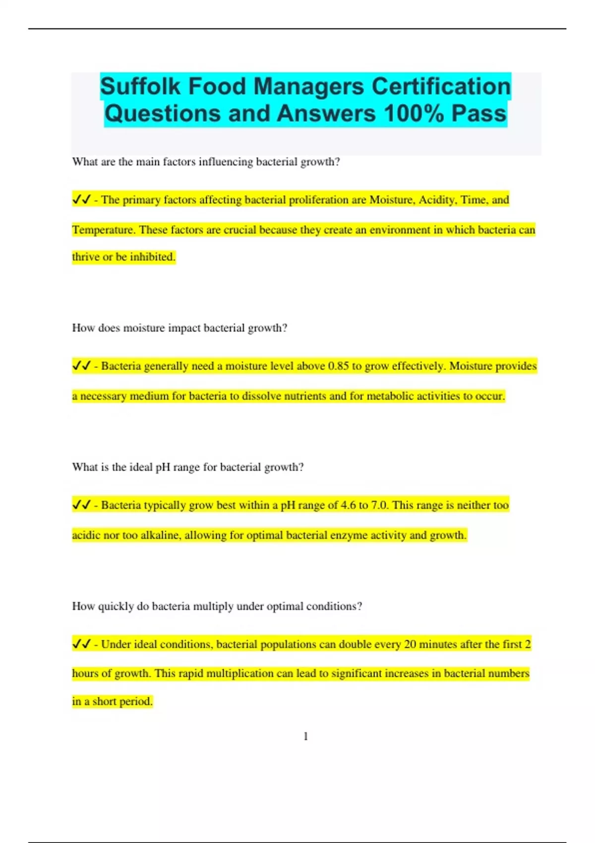 Suffolk Food Managers Certification Questions and Answers 100% Pass What are the main factors influencing bacterial growth? - The primary factors affecting bacterial proliferation are Moisture, Acidity, Time, and Temperature. These factors are crucial because they create an environment in which bacteria can thrive or be inhibited. How does moisture impact bacterial growth? - Bacteria generally need a moisture level above 0.85 to grow effectively. Moisture provides a necessary medium for bacteria to dissolve nutrients and for metabolic activities to occur. What is the ideal pH range for bacterial growth? - Bacteria typically grow best within a pH range of 4.6 to 7.0. This range is neither too acidic nor too alkaline, allowing for optimal bacterial enzyme activity and growth. How quickly do bacteria multiply under optimal conditions? - Under ideal conditions, bacterial populations can double every 20 minutes after the first 2 hours of growth. This rapid multiplication can lead to significant increases in bacterial numbers in a short period. 2 What is the temperature range considered dangerous for bacterial growth? - The temperature danger zone for bacterial growth spans from 41°F to 140°F. Within this range, bacteria can grow rapidly, increasing the risk of foodborne illnesses. What type of environment do psychrophilic bacteria prefer? - Psychrophilic bacteria, or cold-loving bacteria, thrive in cooler temperatures ranging from 32°F to 86°F. They are often found in refrigerated environments and can grow even in low temperatures. What temperatures are favored by mesophilic bacteria? - Mesophilic bacteria prefer moderate temperatures, generally between 122°F and 176°F. They are commonly found in environments like the human body and certain soil conditions. Which bacteria are known for thriving at higher temperatures? - Thermophilic bacteria, also known as heat-loving bacteria, are adapted to high temperatures, typically between 122°F and 176°F. They are often found in hot springs and compost heaps. 3 Which bacterium is most commonly associated with foodborne illnesses? - Salmonella is the leading cause of reported foodborne illnesses. It can contaminate a variety of foods, particularly poultry and eggs, and cause symptoms like nausea, vomiting, and diarrhea. What are the standard temperatures to check when calibrating a thermometer? - To ensure accuracy, thermometers should be checked against known temperatures such as 32°F (freezing point of water) and 212°F (boiling point of water). These calibration points help verify the device’s precision. How long is a food manager’s certification valid? - A food manager’s certification is typically valid for 3 years. This certification ensures that food managers stay updated on best practices and regulations related to food safety. Can a restaurant legally refuse an inspector if they are busy? - No, a restaurant cannot