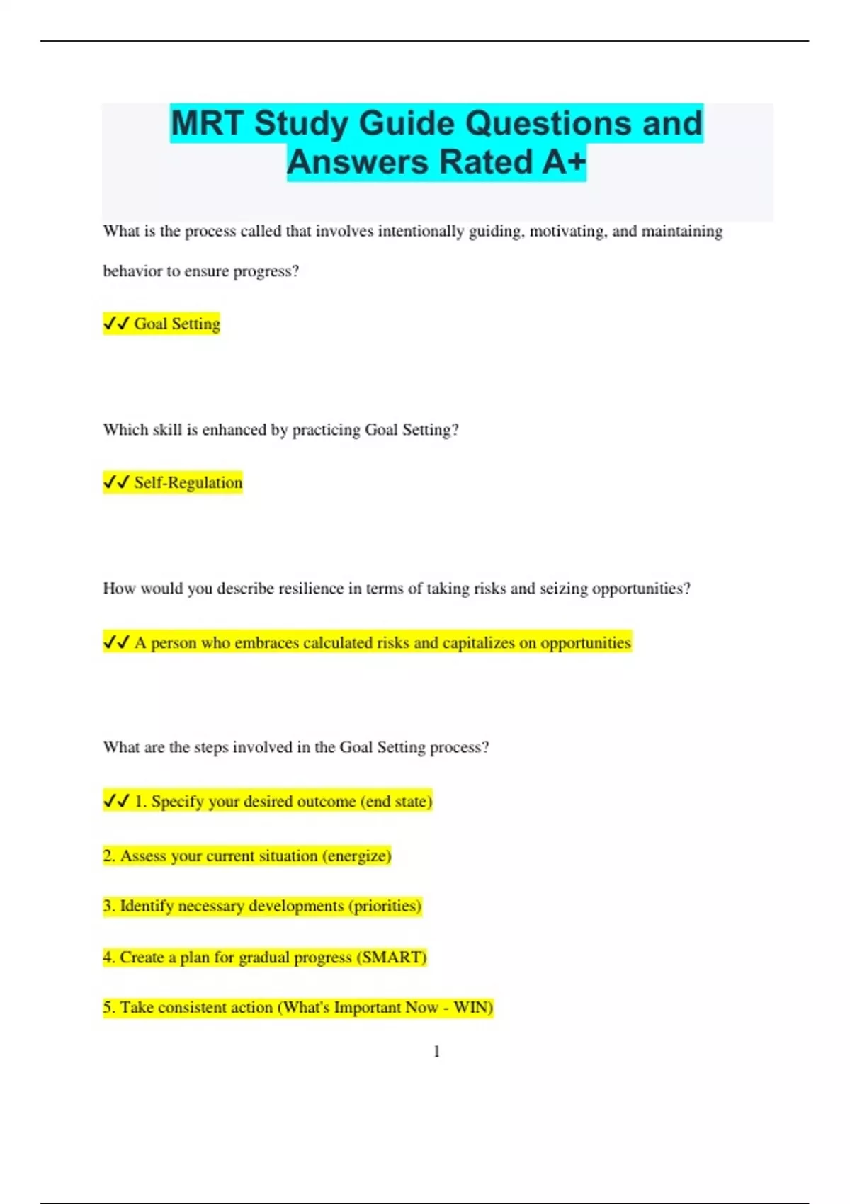MRT Study Guide Questions and Answers Rated A+ What is the process called that involves intentionally guiding, motivating, and maintaining behavior to ensure progress? Goal Setting Which skill is enhanced by practicing Goal Setting? Self-Regulation How would you describe resilience in terms of taking risks and seizing opportunities? A person who embraces calculated risks and capitalizes on opportunities What are the steps involved in the Goal Setting process? 1. Specify your desired outcome (end state) 2. Assess your current situation (energize) 3. Identify necessary developments (priorities) 4. Create a plan for gradual progress (SMART) 5. Take consistent action (What's Important Now - WIN) 2 6. Fully commit to the process (maintain motivation) 7. Regularly review your progress (IPR - In-Process Review) What are some advantages of practicing Hunt the Good Stuff (HTGS)? - Improved health - Reduced depression and increased life satisfaction - Enhanced performance - Stronger relationships What is a key principle of Hunt the Good Stuff (HTGS)? Counteracts the tendency to focus on negative aspects What does the ATC model stand for? Activating Event (AE) - the initial trigger or challenge Thoughts - interpretations of the AE Consequences - emotional or behavioral reactions What emotions or reactions are associated with different thought themes in the ATC model? 3 Loss - sadness/withdrawal Danger - anxiety/agitation Trespass - anger/aggression Inflicting Harm - guilt/apologizing Negative Comparison - embarrassment/hiding Positive Contribution - pride/sharing/planning achievements Appreciating What You've Received - gratitude/giving back/paying forward Positive Future - hope/energizing/taking action
