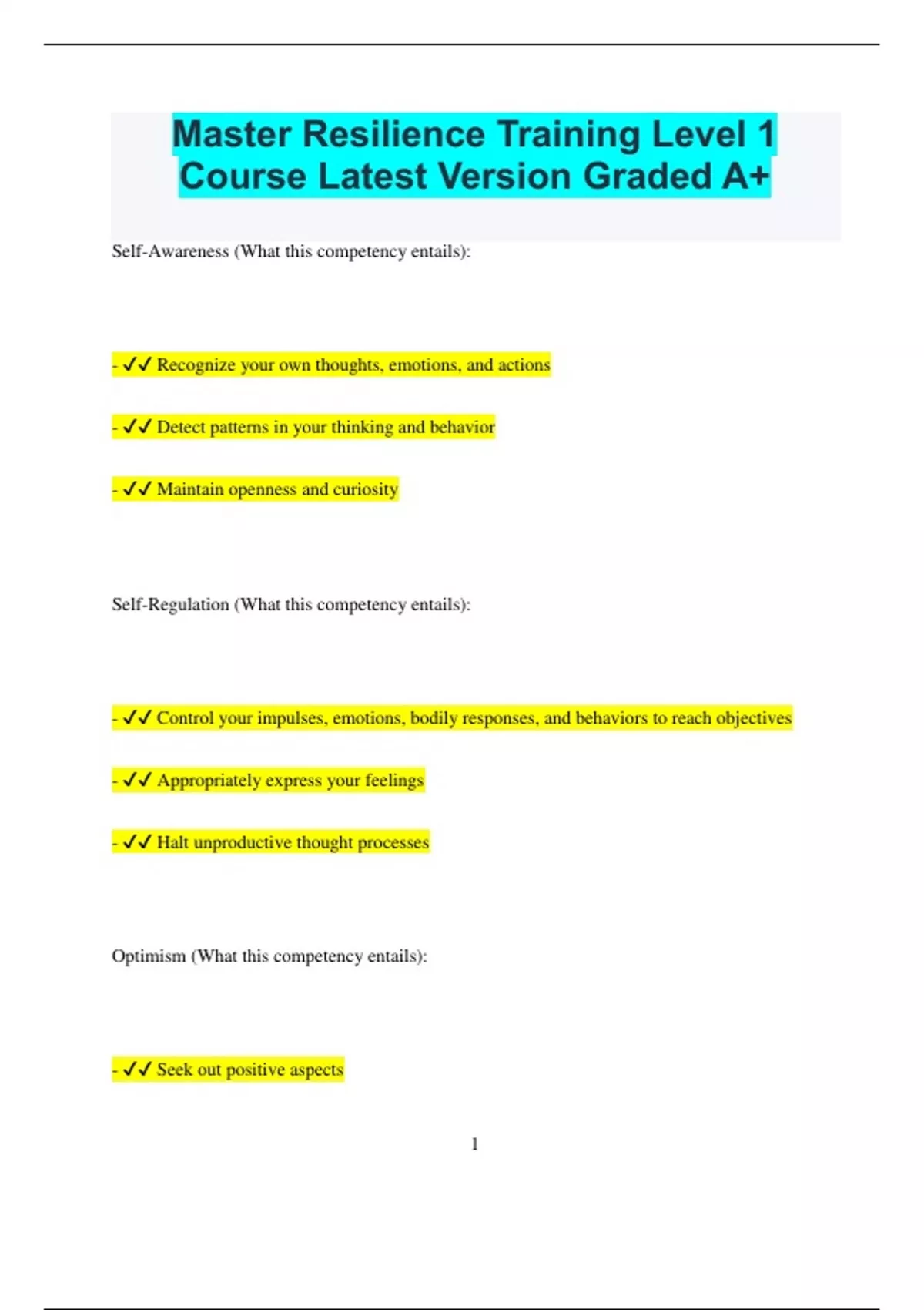 Master Resilience Training Level 1 Course Latest Version Graded A+ Self-Awareness (What this competency entails): - Recognize your own thoughts, emotions, and actions - Detect patterns in your thinking and behavior - Maintain openness and curiosity Self-Regulation (What this competency entails): - Control your impulses, emotions, bodily responses, and behaviors to reach objectives - Appropriately express your feelings - Halt unproductive thought processes Optimism (What this competency entails): - Seek out positive aspects 2 - Counteract negative biases - Stay grounded in reality - Focus on aspects you can control - Keep hope alive - Trust in yourself and your team Mental Agility (What this competency entails): - Think flexibly, accurately, and thoroughly (FAT) - Consider different viewpoints - Recognize and understand issues - Be open to trying new approaches Strength of Character (What this competency entails): - Understand your primary character strengths and how to leverage them to overcome challenges and achieve goals 3 - Trust in your strengths, skills, and abilities - Exhibit a resilient and confident