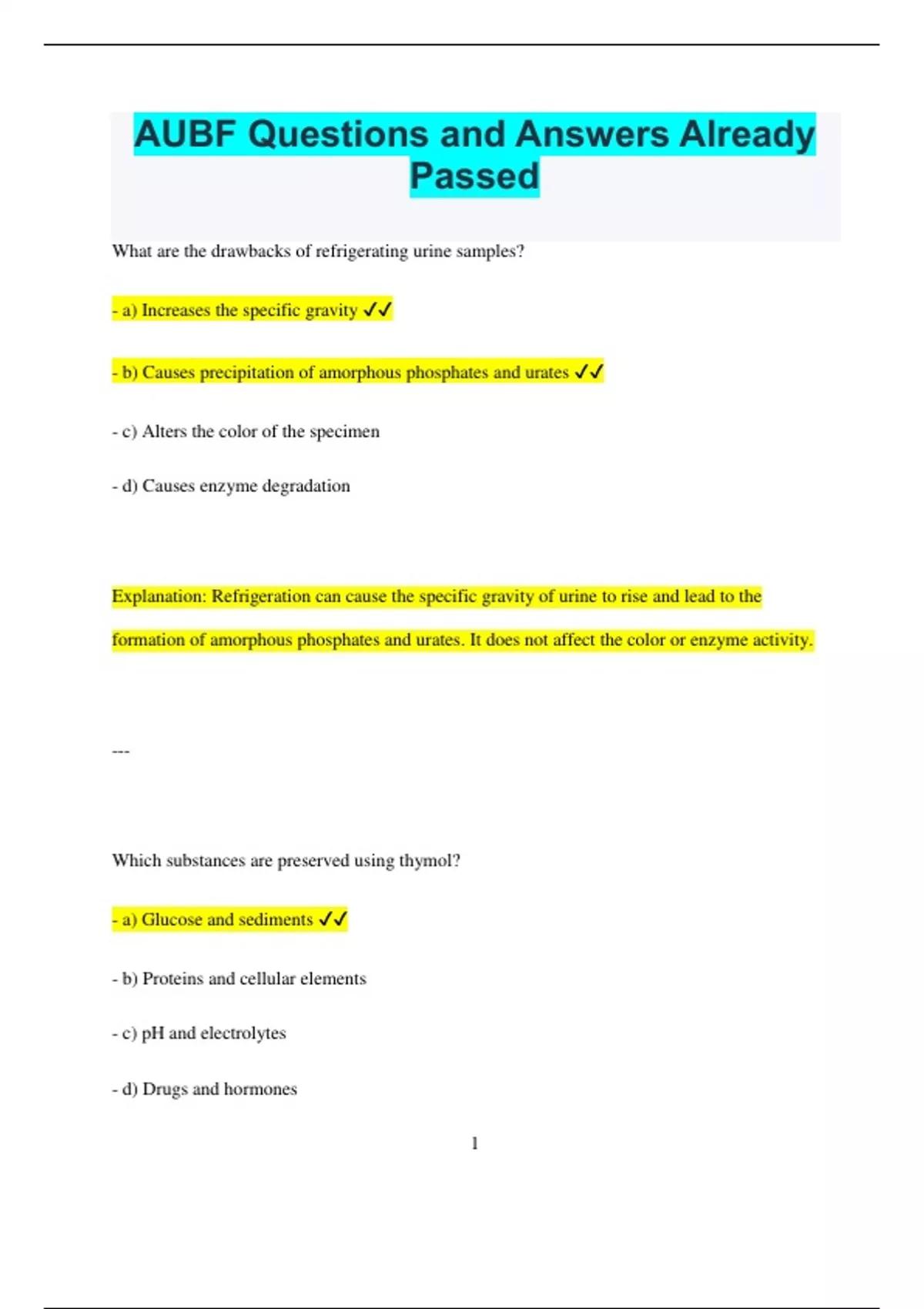 AUBF Questions and Answers Already Passed What are the drawbacks of refrigerating urine samples? - a) Increases the specific gravity - b) Causes precipitation of amorphous phosphates and urates - c) Alters the color of the specimen - d) Causes enzyme degradation Explanation: Refrigeration can cause the specific gravity of urine to rise and lead to the formation of amorphous phosphates and urates. It does not affect the color or enzyme activity. --- Which substances are preserved using thymol? - a) Glucose and sediments - b) Proteins and cellular elements - c) pH and electrolytes - d) Drugs and hormones 2 Explanation: Thymol is commonly used to preserve glucose and sediment in urine samples by preventing their degradation. --- What does boric acid preserve in urine specimens? - a) Proteins and formed elements - b) Glucose and sediments - c) pH and electrolytes - d) Hormones and drugs Explanation: Boric acid helps in preserving proteins and formed elements by maintaining the sample's stability during storage. --- What is considered an excellent preservative for urine sediment? - a) Sodium fluoride 3 - b) Saccomanno fixative - c) Thymol