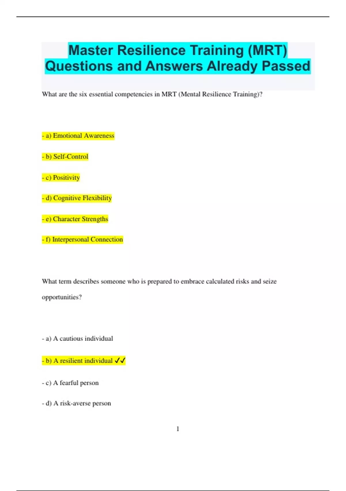 Master Resilience Training (MRT) Questions and Answers Already Passed What are the six essential competencies in MRT (Mental Resilience Training)? - a) Emotional Awareness - b) Self-Control - c) Positivity - d) Cognitive Flexibility - e) Character Strengths - f) Interpersonal Connection What term describes someone who is prepared to embrace calculated risks and seize opportunities? - a) A cautious individual - b) A resilient individual - c) A fearful person - d) A risk-averse person 2 What does resilience mean? - a) The ability to endure without change - b) The capacity to prosper and advance despite difficulties and to recover quickly from setbacks - c) The skill to avoid challenges - d) The talent to remain unaffected by stress What are some common misconceptions about resilience? - - Showing emotion is a weakness - - Resilience is solely about the individual - - One must handle everything independently - - Immediate action is always required - - One must always remain completely composed - - You either possess resilience or you do not - - Resilient individuals never experience burnout 3 Which core competency involves recognizing your own thoughts, emotions, actions, and physiological responses, especially those that are counterproductive; staying open and inquisitive? - Self-Awareness Which core competency refers to managing impulses, emotions, and actions to reach objectives; appropriately expressing feelings and halting