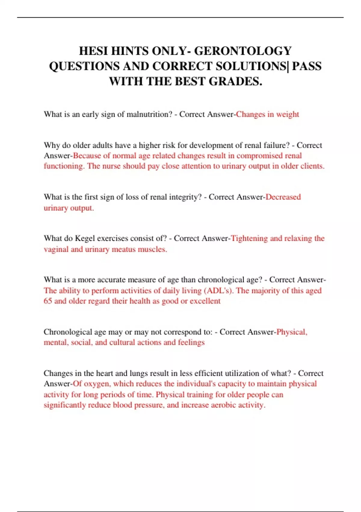 HESI HINTS ONLY- GERONTOLOGY QUESTIONS AND CORRECT SOLUTIONS| PASS WITH THE BEST GRADES.