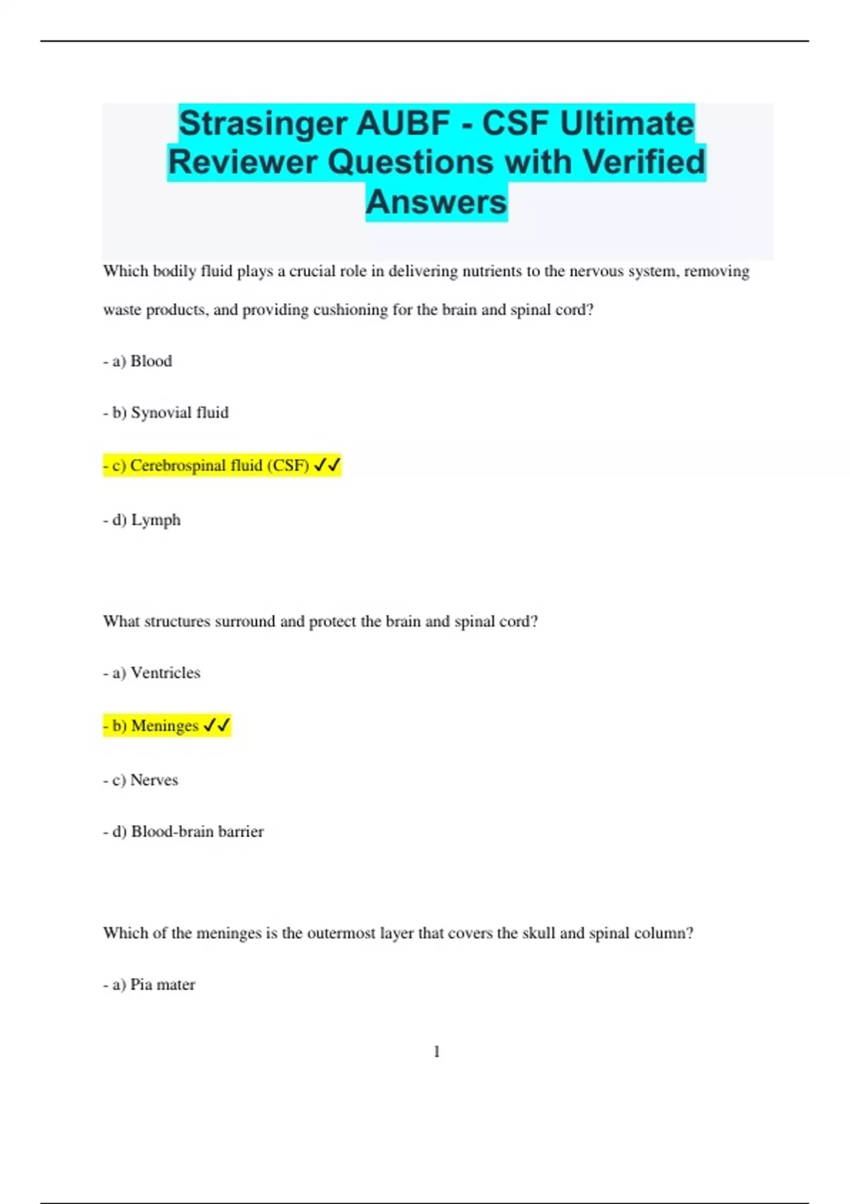 Strasinger AUBF - CSF Ultimate Reviewer Questions with Verified Answers Which bodily fluid plays a crucial role in delivering nutrients to the nervous system, removing waste products, and providing cushioning for the brain and spinal cord? - a) Blood - b) Synovial fluid - c) Cerebrospinal fluid (CSF) - d) Lymph What structures surround and protect the brain and spinal cord? - a) Ventricles - b) Meninges - c) Nerves - d) Blood-brain barrier Which of the meninges is the outermost layer that covers the skull and spinal column? - a) Pia mater 2 - b) Arachnoid - c) Dura mater - d) Choroid plexus What is the literal translation of the term "dura mater"? - a) Soft mother - b) Spongy layer - c) Hard mother - d) Thin layer What is the name of the inner, filamentous layer of the meninges that resembles a spider's web? - a) Pia mater - b) Choroid plexus - c) Arachnoid - d) Dura mater What does "arachnoid" mean in anatomical terms? - a) Soft and delicate 3 - b) Tough layer - c) Spiderweb-like - d) Hard surface Which membrane, known as the pia mater, is the thinnest layer covering the brain and spinal cord? - a) Arachnoid - b) Dura mater - c) Pia mater - d) Choroid plexus The term "pia mater" translates to what in anatomical terminology? - a) Hard mother - b) Gentle mother - c) Spiderweb-like - d) Tough layer