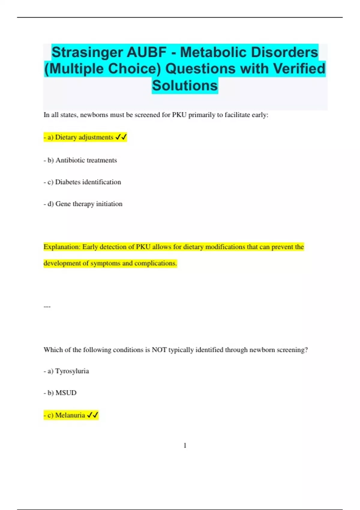Strasinger AUBF - Metabolic Disorders (Multiple Choice) Questions with Verified Solutions In all states, newborns must be screened for PKU primarily to facilitate early: - a) Dietary adjustments - b) Antibiotic treatments - c) Diabetes identification - d) Gene therapy initiation Explanation: Early detection of PKU allows for dietary modifications that can prevent the development of symptoms and complications. --- Which of the following conditions is NOT typically identified through newborn screening? - a) Tyrosyluria - b) MSUD - c) Melanuria 2 - d) Galactosemia Explanation: Melanuria, which involves the presence of melanins in urine, is not usually detected through newborn screening, unlike the other listed conditions. --- For the most effective early detection during newborn screening, the ideal sample is: - a) A specific timed urine sample - b) A blood sample - c) A first-morning urine sample - d) A fecal sample Explanation: Blood specimens are preferred for newborn screening as they provide accurate and reliable results for detecting various metabolic disorders. --- 3 Among the following, which condition does NOT fall under the category of overflow disorders in urine screening? - a) Alkaptonuria - b) Galactosemia - c) Melanuria - d) Cystinuria Explanation: Melanuria is not classified as an overflow