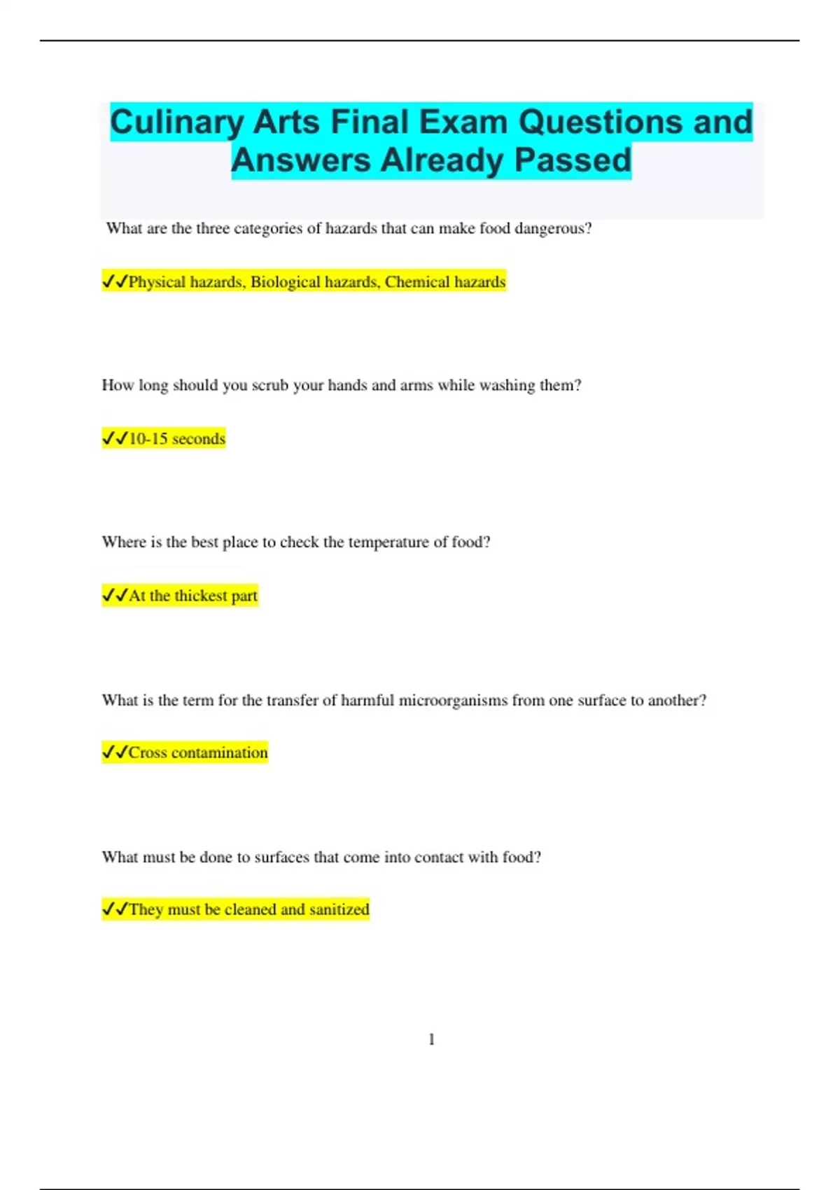 Culinary Arts Final Exam Questions and Answers Already Passed What are the three categories of hazards that can make food dangerous? Physical hazards, Biological hazards, Chemical hazards How long should you scrub your hands and arms while washing them? 10-15 seconds Where is the best place to check the temperature of food? At the thickest part What is the term for the transfer of harmful microorganisms from one surface to another? Cross contamination What must be done to surfaces that come into contact with food? They must be cleaned and sanitized 2 Which federal agency is responsible for enforcing workplace safety standards? OSHA What type of footwear should foodservice workers avoid? Open-toed shoes What should workers say when carrying hot food to alert others? "Hot" When lifting heavy objects, you should bend at your... Knees and lift with your legs How should you pass a knife to another person safely? Place it on a table for the other person to pick up In what temperature range do harmful microorganisms thrive in food? 41°F-135°F 3 What is the safe internal cooking temperature for poultry such as chicken and turkey? 165°F Which kitchen tool is used to strain liquids