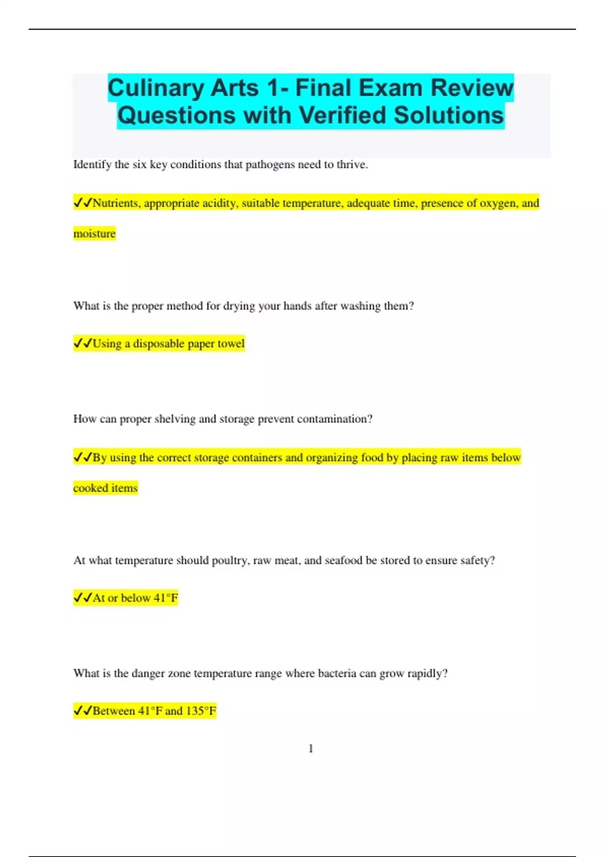 Culinary Arts 1- Final Exam Review Questions with Verified Solutions Identify the six key conditions that pathogens need to thrive. Nutrients, appropriate acidity, suitable temperature, adequate time, presence of oxygen, and moisture What is the proper method for drying your hands after washing them? Using a disposable paper towel How can proper shelving and storage prevent contamination? By using the correct storage containers and organizing food by placing raw items below cooked items At what temperature should poultry, raw meat, and seafood be stored to ensure safety? At or below 41°F What is the danger zone temperature range where bacteria can grow rapidly? Between 41°F and 135°F 2 Where should chemicals be kept to ensure they do not contaminate food? Stored securely and away from any food items What defines a foodborne illness? An illness resulting from consuming contaminated food If you cut your finger while preparing vegetables, what should you do first? Stop the bleeding by applying gentle pressure What should a food handler do if they have a wound on their hand and need to handle food? Cover the wound with a bandage and wear a glove What is the required reheating temperature for TCS (Time/Temperature Control for Safety) foods within two hours? 165°F List three ways to prevent cuts when using a knife. 3 Always cut away from yourself, never attempt to catch a falling knife, and avoid leaving knives submerged in water Name three strategies to prevent cross-contamination in the kitchen. Change gloves between different tasks, regularly clean and sanitize work areas and tools, and use designated sinks for different purposes What are the responsibilities of an Executive Chef? Overseeing all kitchen operations and ensuring the kitchen staff is well-trained Describe the role of a Sous Chef. Assisting in the supervision and coordination of food preparation activities What tasks are performed by a Pastry Chef?