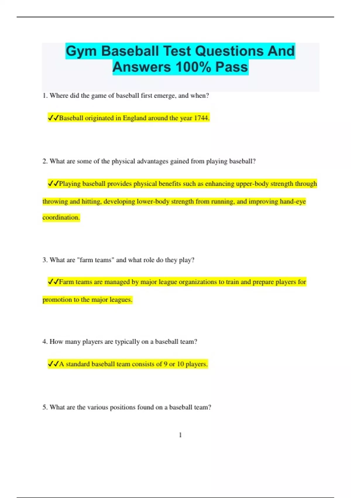 Gym Baseball Test Questions And Answers 100% Pass 1. Where did the game of baseball first emerge, and when? Baseball originated in England around the year 1744. 2. What are some of the physical advantages gained from playing baseball? Playing baseball provides physical benefits such as enhancing upper-body strength through throwing and hitting, developing lower-body strength from running, and improving hand-eye coordination. 3. What are "farm teams" and what role do they play? Farm teams are managed by major league organizations to train and prepare players for promotion to the major leagues. 4. How many players are typically on a baseball team? A standard baseball team consists of 9 or 10 players. 5. What are the various positions found on a baseball team? 2 Positions on a baseball team include pitcher, catcher, shortstop, designated hitter, first baseman, second baseman, third baseman, left fielder, right fielder, and center fielder. 6. What is a "single" in baseball? A single is a type of hit where the batter reaches first base safely but does not advance further. 7. What defines a "double" in baseball? A double occurs when the batter reaches second base safely without advancing any further. 8. Under what circumstances is a pitched ball called a "ball"? A pitched ball is designated as a "ball" if it does not enter the strike zone and the batter does not attempt to swing at it. 9. How is a successful slide into a base performed? To execute a proper slide into a base, the player should drop to the ground in a controlled manner, usually by falling backward onto the outer part of the knee and lower leg. 10. Why is the pitcher regarded as a crucial defensive player?
