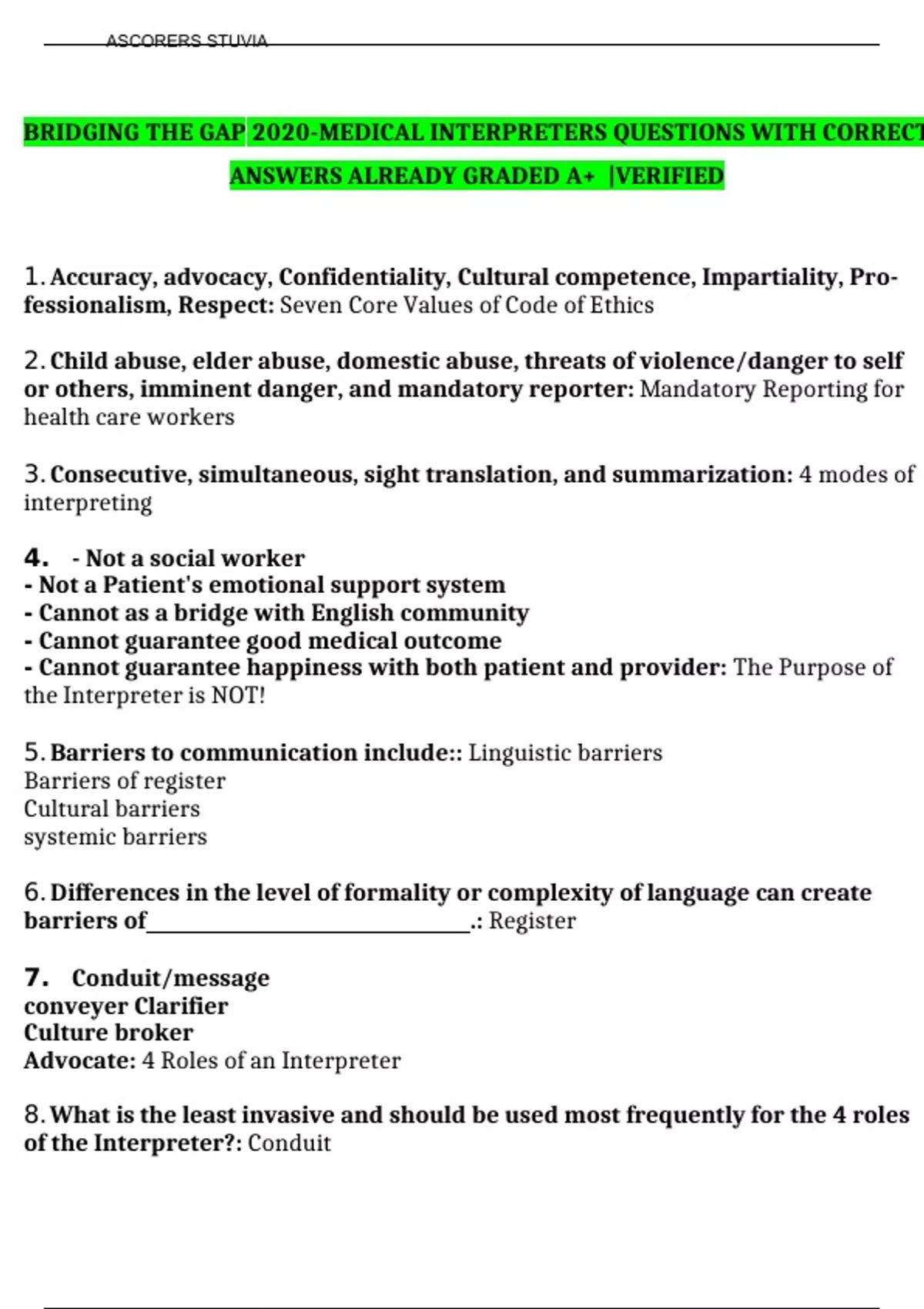 BRIDGING THE GAP 2020-MEDICAL INTERPRETERS QUESTIONS WITH CORRECT ANSWERS ALREADY GRADED A+ |VERIFIED