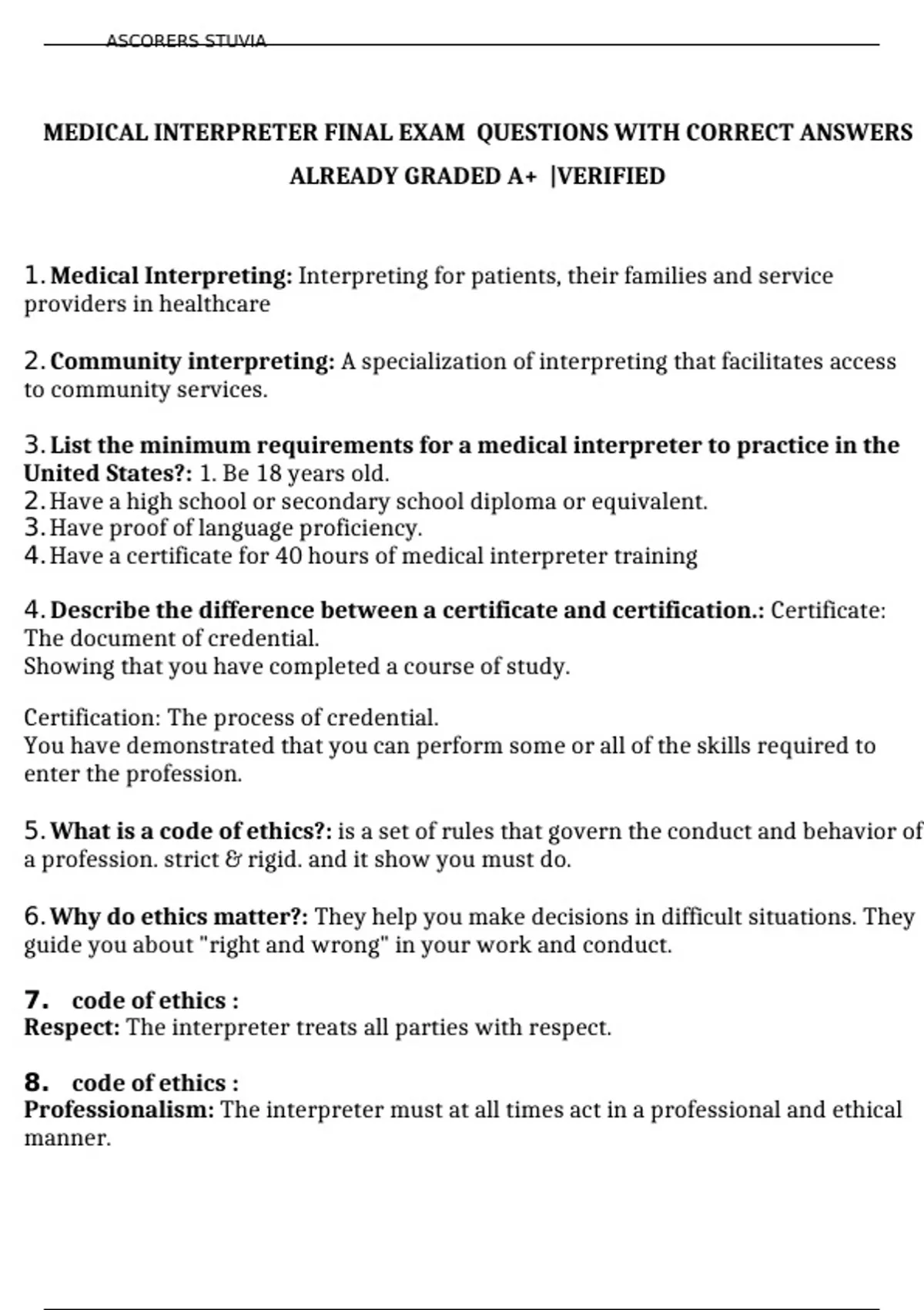 MEDICAL INTERPRETER FINAL EXAM QUESTIONS WITH CORRECT ANSWERS ALREADY GRADED A+ |VERIFIED