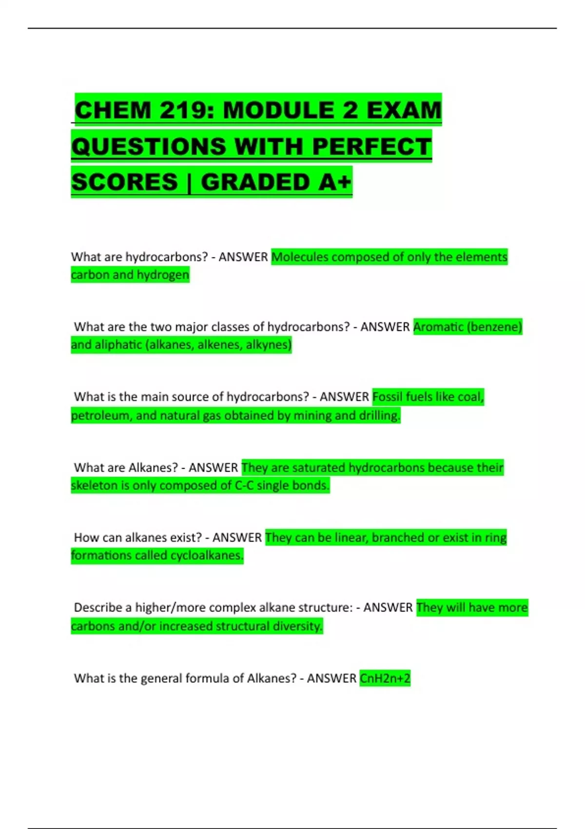 CHEM 219: MODULE 2 EXAM QUESTIONS WITH PERFECT SCORES | GRADED A What are hydrocarbons? - ANSWER Molecules composed of only the elements carbon and hydrogen What are the two major classes of hydrocarbons? - ANSWER Aromatic (benzene) and aliphatic (alkanes, alkenes, alkynes) What is the main source of hydrocarbons? - ANSWER Fossil fuels like coal, petroleum, and natural gas obtained by mining and drilling. What are Alkanes? - ANSWER They are saturated hydrocarbons because their skeleton is only composed of C-C single bonds. How can alkanes exist? - ANSWER They can be linear, branched or exist in ring formations called cycloalkanes. Describe a higher/more complex alkane structure: - ANSWER They will have more carbons and/or increased structural diversity. What is the general formula of Alkanes? - ANSWER CnH2n+2 The names of the alkanes reflect? - ANSWER The number of carbons present. How many isomers does each alkane have from 1-10 - ANSWER 1,1,1,2,3,5,9,18,35,75 Name the first ten prefix of alkanes: - ANSWER Methane, ethane, propane, butane, pentane, hexane, heptane, octane, nonane, decane. As the molecular weight increases: - ANSWER The number of isomers increase. What does the suffix -ane mean? - ANSWER Denotes a saturated hydrocarbon. It is used for all acyclic saturated alkanes What is nomenclature? - ANSWER The naming of a molecular structure. Historically they were named after their source, now they are systemic. Why is nomenclature important? - ANSWER Because we cannot remember all the prefixes since a MF composed of carbons can have several different patterns of connectivity. What is it meant by the systemic approach? - ANSWER There are now methods of naming molecules so that they all have unique names. You can then determine the structure from only the name and vice-versa. IUPAC rules for naming branced alkanes: - ANSWER 1. Find the parent name by identifying the longest continuous chain of carbons. 2. Number the parent chain. (begin at the end of the chain nearest to the first branch.) 3. If there are two equally long continuous chains, select the one with most branches. 4. If the first branch point is the same distance, choose the one that gives the lowest substituents. 5. If the substituents are both equidistant then choose the numbering so the substituent goes with the higher alphabetic priority. How are linear alkanes named? - ANSWER By combining the prefix indicating the number to the suffix -ane. What is a substituent? - ANSWER Any group attached to the parent chain. What are alkyl groups? - ANSWER Saturated hydrocarbon substituents. You drop the -yl for -ane. A one carbon substituent is a methyl group, four carbon is butyl. What is aWhat are hydrocarbons? - ANSWER Molecules composed of only the elements carbon and hydrogen What are the two major classes of hydrocarbons? - ANSWER Aromatic (benzene) and aliphatic (alkanes, alkenes, alkynes) What is the main source of hydrocarbons? - ANSWER Fossil fuels like coal, petroleum, and natural gas obtained by mining and drilling. What are Alkanes? - ANSWER They are saturated hydrocarbons because their skeleton is only composed of C-C single bonds. How can alkanes exist? - ANSWER They can be linear, branched or exist in ring formations called cycloalkanes. Describe a higher/more complex alkane structure: - ANSWER They will have more carbons and/or increased structural diversity. What is the general formula of Alkanes? - ANSWER CnH2n+2 The names of the alkanes reflect? - ANSWER The number of carbons present. How many isomers does each alkane have from 1-10 - ANSWER 1,1,1,2,3,5,9,18,35,75 Name the first ten prefix of alkanes: - ANSWER Methane, ethane, propane, butane, pentane, hexane, heptane, octane, nonane, decane. As the molecular weight increases: - ANSWER The number of isomers increase. What does the suffix -ane mean? - ANSWER Denotes a saturated hydrocarbon. It is used for all acyclic saturated alkanes What is nomenclature? - ANSWER The naming of a molecular structure. Historically they were named after their source, now they are systemic. Why is nomenclature important? - ANSWER Because we cannot remember all the prefixes since a MF composed of carbons can have several different patterns of connectivity. What is it meant by the systemic approach? - ANSWER There are now methods of naming molecules so that they all have unique names. You can then determine the structure from only the name and vice-versa. IUPAC rules for naming branced alkanes: - ANSWER 1. Find the parent name by identifying the longest continuous chain of carbons. 2. Number the parent chain. (begin at the end of the chain nearest to the first branch.) 3. If there are two equally long continuous chains, select the one with most branches. 4. If the first branch point is the same distance, choose the one that gives the lowest substituents. 5. If the substituents are both equidistant then choose the numbering so the substituent goes with the higher alphabetic priority. How are linear alkanes named? - ANSWER By combining the prefix indicating the number to the suffix -ane. What is a substituent? - ANSWER Any group attached to the parent chain. What are alkyl groups? - ANSWER Saturated hydrocarbon substituents. You drop the -yl for -ane. A one carbon substituent is a methyl group, four carbon is butyl. What is a locant? - ANSWER A number used to determine the suffix. Describes the position of substituents.? - ANSWER A number used to determine the suffix. Describes the position of substituents.
