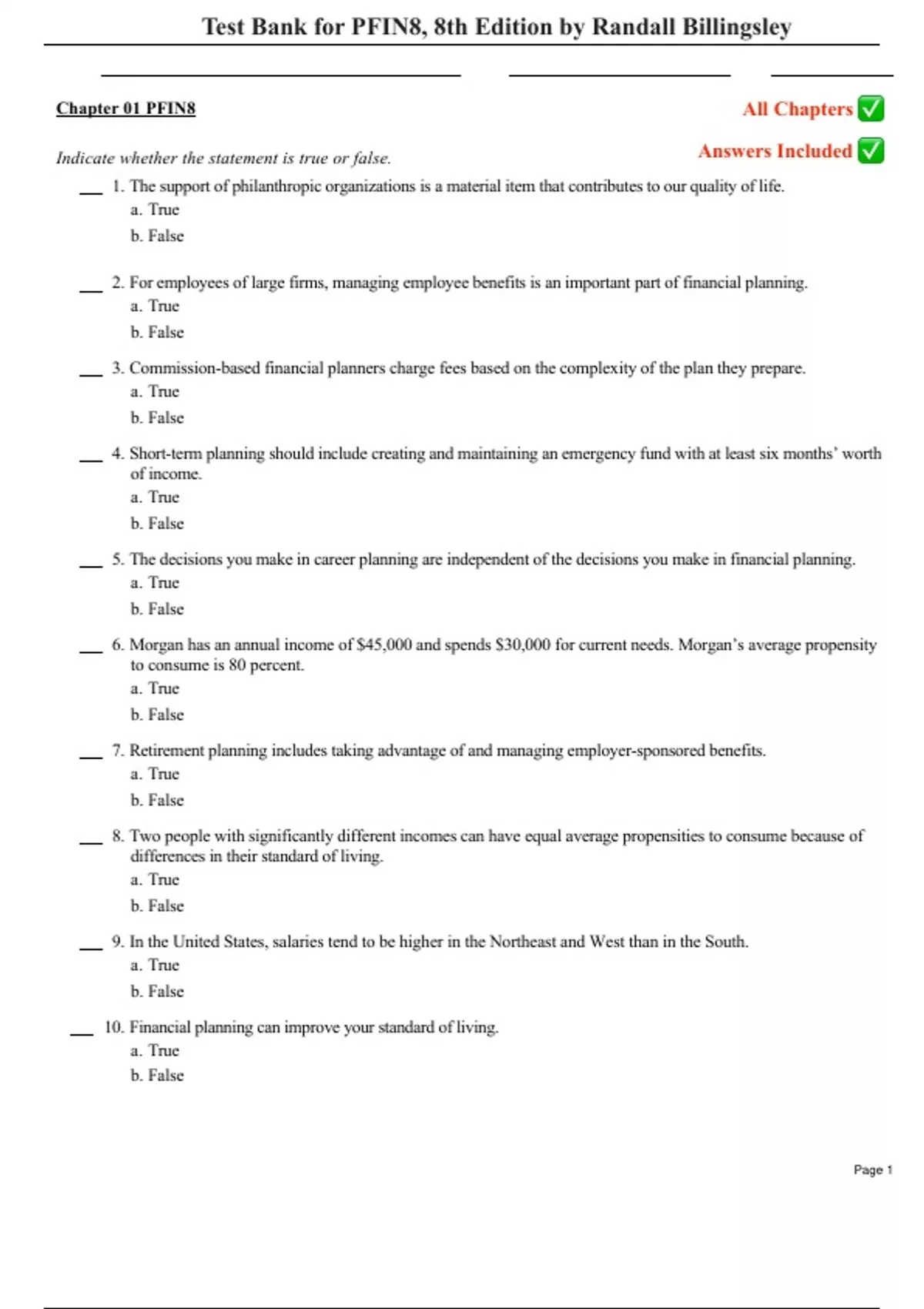 1 Chapter 01 PFIN8Test Bank for PFIN8, 8th Edition by Randall Billingsley�������������