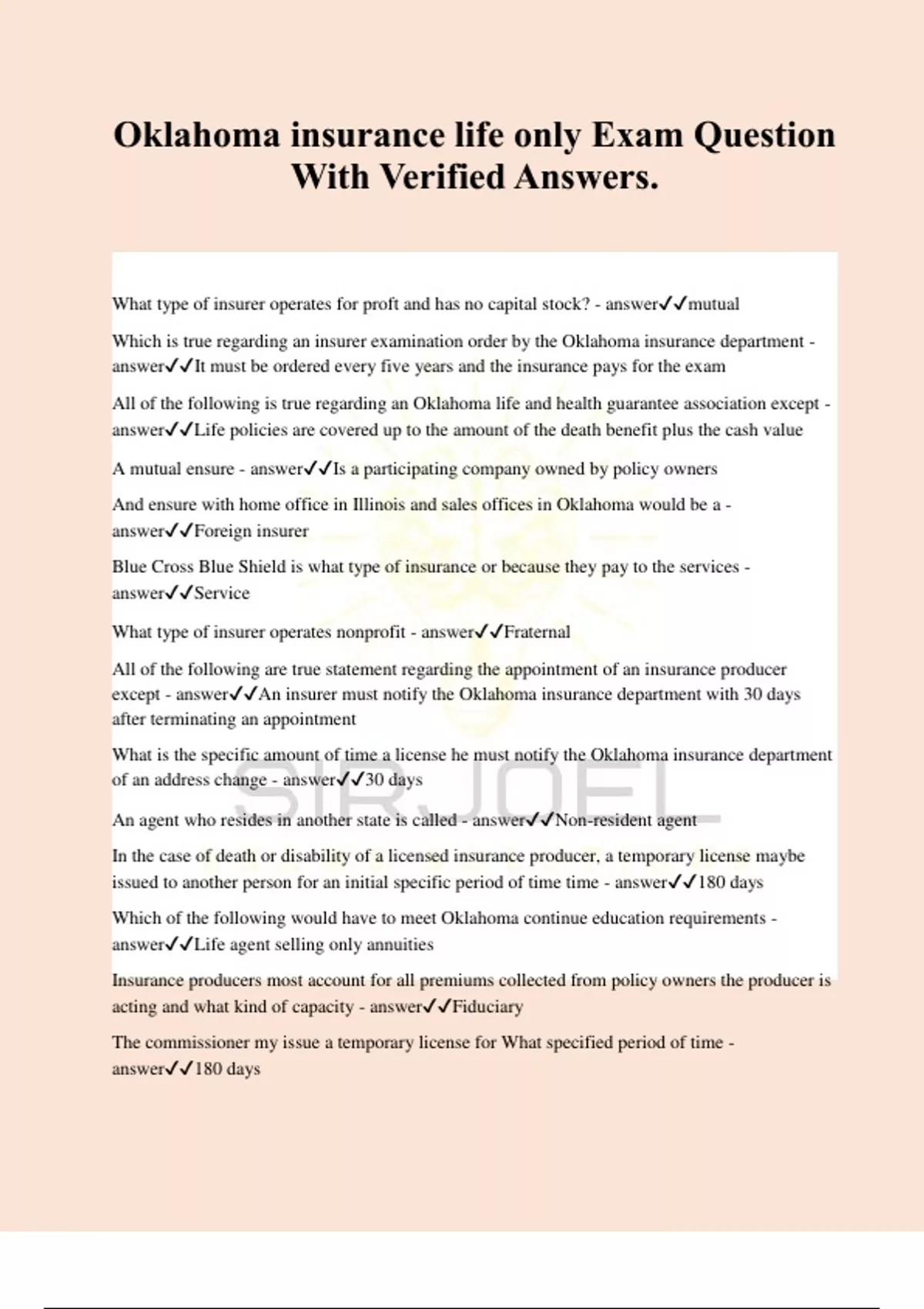 Oklahoma insurance life only Exam Question With Verified Answers.