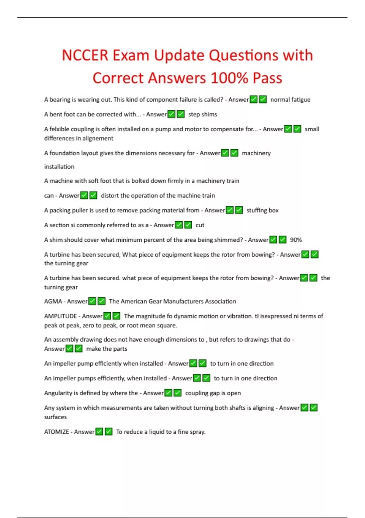 NCCER Exam Update Questions with Correct Answers 100% Pass A bearing is wearing out. This kind of component failure is called? - Answer normal fatigue A bent foot can be corrected with... - Answer step shims A felxible coupling is often installed on a pump and motor to compensate for... - Answer small differences in alignement A foundation layout gives the dimensions necessary for - Answer machinery installation A machine with soft foot that is bolted down firmly in a machinery train can - Answer distort the operation of the machine train A packing puller is used to remove packing material from - Answer stuffing box A section si commonly referred to as a - Answer cut A shim should cover what minimum percent of the area being shimmed? - Answer 90% A turbine has been secured, What piece of equipment keeps the rotor from bowing? - Answer the turning gear A turbine has been secured. what piece of equipment keeps the rotor from bowing? - Answer the turning gear AGMA - Answer The American Gear Manufacturers Association AMPLITUDE - Answer The magnitude fo dynamic motion or vibration. tI isexpressed ni terms of peak ot peak, zero to peak, or root mean square. An assembly drawing does not have enough dimensions to , but refers to drawings that do - Answer make the parts An impeller pump efficiently when installed - Answer to turn in one direction An impeller pumps efficiently, when installed - Answer to turn in one direction Angularity is defined by where the - Answer coupling gap is open