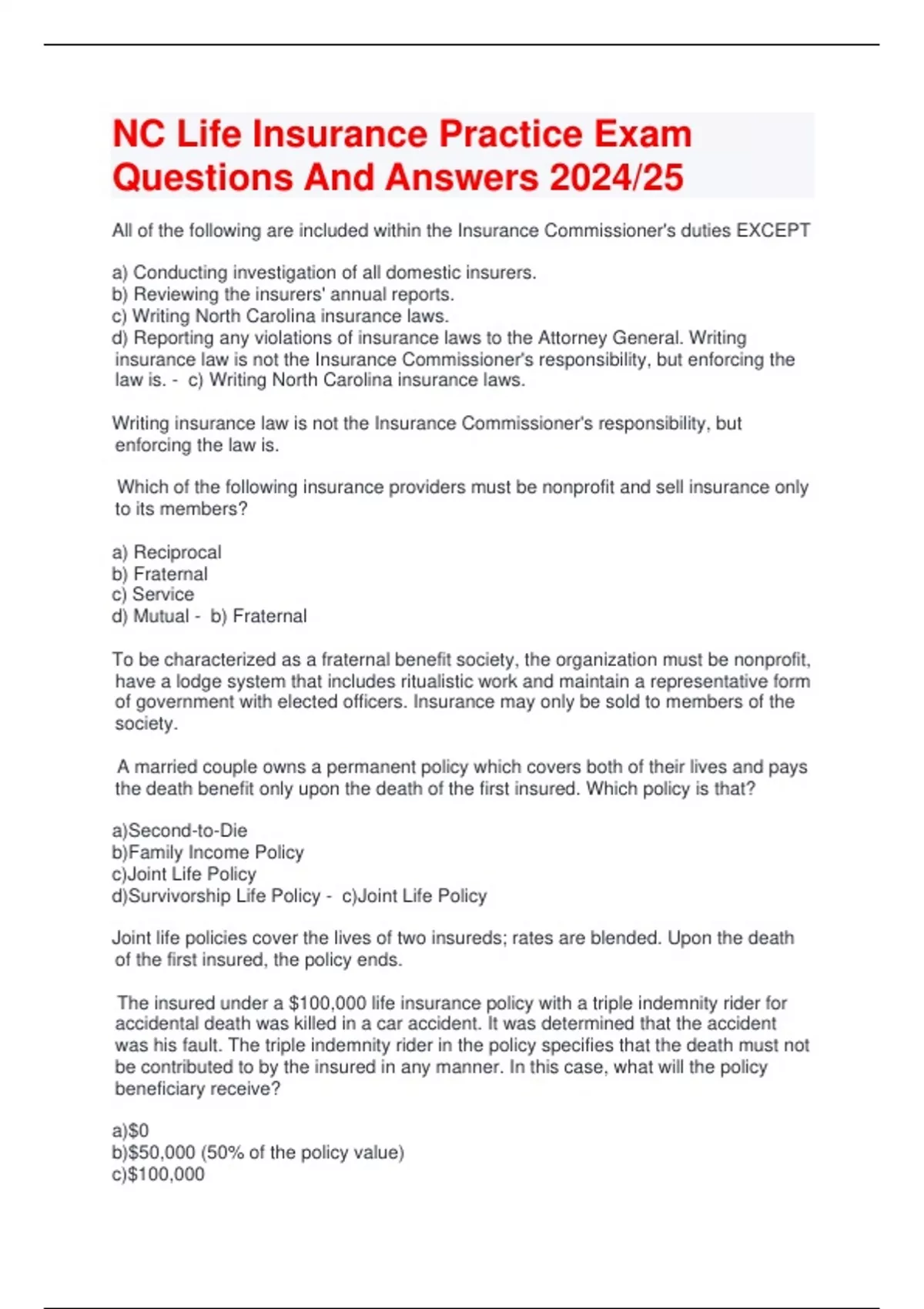 NC Life Insurance Practice Exam Questions And Answers 2024/25