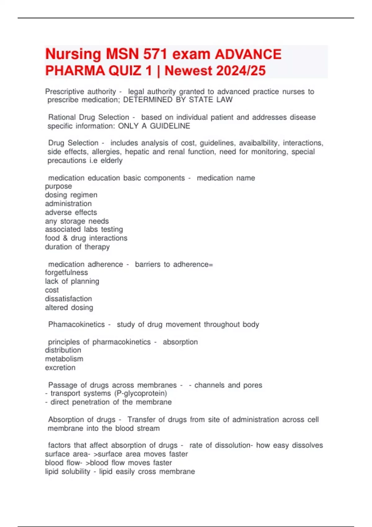Nursing MSN 571 exam ADVANCE PHARMA QUIZ 1 | New est 2024/25 Prescriptive zzauthority zz- zz zzlegal zzauthority zzgranted zzto zzadvanced zzpractice zznurses zzto zzprescribe zzmedication; zzDETERMINED zzBY zzSTATE zzLAW zzRational zzDrug zzSelection zz- zz zzbased zzon zzindividual zzpatient zzand zzaddresses zzdisease zzspecific zzinformation: zzONLY zzA zzGUIDELINE zzDrug zzSelection zz- zz zzincludes zzanalysis zzof zzcost, zzguidelines, zzavaibalbility, zzinteractions, zzside zzeffects, zzallergies, zzhepatic zzand zzrenal zzfunction, zzneed zzfor zzmonitoring, zzspecial zzprecautions zzi.e zzelderly zzmedication zzeducation zzbasic zzcomponents zz- zz zzmedication zzname purpose dosing zzregimen administration adverse zzeffects any zzstorage zzneeds associated zzlabs zztesting food zz& zzdrug zzinteractions duration zzof zztherapy zzmedication zzadherence zz- zz zzbarriers zzto zzadherence= forgetfulness lack zzof zzplanning cost dissatisfaction altered zzdosing zzPhamacokinetics zz- zz zzstudy zzof zzdrug zzmovement zzthroughout zzbody zzprinciples zzof zzpharmacokinetics zz- zz zzabsorption distribution metabolism excretion zzPassage zzof zzdrugs zzacross zzmembranes zz- zz zz- zzchannels zzand zzpores - zztransport zzsystems zz(P-glycoprotein) - zzdirect zzpenetration zzof zzthe zzmembrane zzAbsorption zzof zzdrugs zz- zz zzTransfer zzof zzdrugs zzfrom zzsite zzof zzadministration zzacross zzcell zzmembrane zzinto zzthe zzblood zzstream zzfactors zzthat zzaffect zzabsorption zzof zzdrugs zz- zz zzrate zzof zzdissolution - zzhow zzeasy zzdissolves surface zzarea- zz>surface zzarea zzmoves zzfaster blood zzflow- zz>blood zzflow zzmoves zzfaster lipid zzsolubility zz- zzlipid zzeasily zzcross zzmembrane ph zzpartitioning zz- zzDistribution zzof zzdrugs zz- zz zzmovement zzof zzdrugs zzfrom zzsystemic zzcirculation zzto zzsite zzof zzdrug zzaction zzfactors zzthat zzdetermine zzdrug zzflow zz- zz zzblood zzflow zzto zztissues ability zzto zzexit zzvascular zzsystem ability zzto zzenter zzcell zzDrug zzability zzto zzexit zzvascular zzsystem zz- zz zzcapillary zzbed- zztypical zz blood zzbrain zzbarreier placenta zzdrug zztransfer protein zzbinding zz- zzalbumin zzdrug zzability zzto zzenter zzcell zz- zz zzbinds zzwith zzreceptors zzon zzexternal zzsurface zzof zzcell zzmembrane zzdrug zzmetabolism zz- zz zzthe zzenzymatic zzbiotransformation zzof zza zzdrug zzstructure most zzoccur zzin zzliver zzby zzP450 zzsystem zzfirst zzpass zzeffect zz- zz zzrapid zzhepatic zzinactivation zzof zzdrug zzon zzits zzfirst zzpass zzthrough zzliver zzdrug zzexcretion zz- zz zzelimination zzof zza zzdrug zzfrom zzthe zzbody zzDrug zzExcretion zzRoutes zz- zz zzrenal breast zzmilk bile lungs sweat saliva zztherapeutic zzdrug zzrange zz- zz zzrange zzof zzdrug zzbetween zzminimum zzeffective zzdose zzand zztoxic zzdose. zzlarger zzindex zz- zzsafer zzdose zzsmaller zzindex - zzharmful zzdose zzdrug zzhalf zzlife zz- zz zzthe zztime zzrequired zzfor zzthe zzamount zzof zzdrug zzin zzthe zzbody zzto zzdecrease zzby zz50% zzPhamacodynamics zz- zz zzbiochemical zzand zzphysiological zzeffects zzof zzdrugs zzon zzbody zzdose -response zzrelationship zz- zz zzthe zzrelationship zzbetween zzthe zzsize zzof zzan zzadministered zzdose zzand zzthe zzintensity zzit zzproduces zzDrug zzselectivity zz- zz zzdrug zzis zzeffective zzin zzintended zzuse zzw/out zzharmful zzeffects zzbut zzcauses zzundesired zzeffects zz(<BP zzbut zz> zznausea) zzease zzof zzadministration zz- zz zzincreases zzconvenience zzand zzadherence zzand zzdecreases zzadministration zzefforts zzDrug zzaffinity zz- zz zzstrength zzof zzattraction zzbetween zza zzdrug zzand zzits zzreceptor