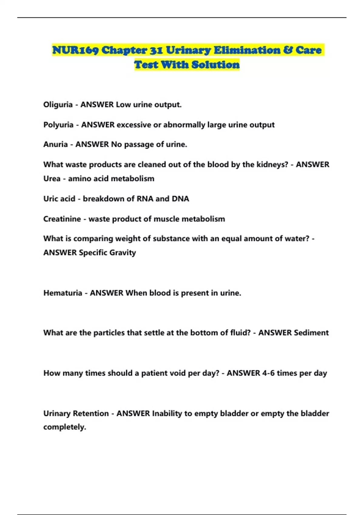 NUR169 Chapter 31 Urinary Elimination & Care Test With Solution...