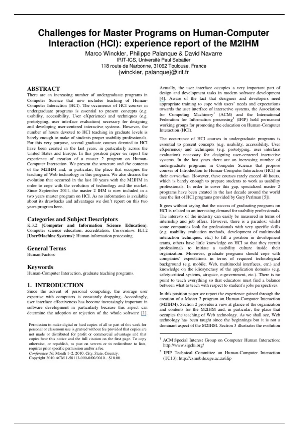 1. INTRODUCTION Since the advent of personal computing, the average user expertise with computers is constantly dropping. Accordingly, user interface effectiveness has become increasingly important in software development in particularly because this aspect can determine the adoption or rejection of the whole software [1]. Actually, the user interface occupies a very important part of design and development tasks in modern software development [4]. Aware of the fact that designers and developers need appropriate training to cope with users’ needs and expectations towards the user interface of interactive systems, the Association for Computing Machinery1 (ACM) and the International Federation for Information processing2 (IFIP) hold permanent working groups for promoting the education on Human-Computer Interaction (HCI). The occurrence of HCI courses in undergraduate programs is essential to present concepts (e.g. usability, accessibility, User eXperience) and techniques (e.g. prototyping, user interface evaluation) necessary for designing user-centered interactive systems. In the last years there are an increasing number of undergraduate programs in Computer Science that propose courses of Introduction to Human-Computer Interaction (HCI) in their curriculum. However, these courses rarely exceed 40 hours, which is barely enough to prepare students to work as usability professionals. In order to cover this gap, specialized master 2 programs have been created in the last decade around the world (see the list of HCI programs provided by Gary Perlman [5]). It goes without saying that the success of graduating programs on HCI is related to an increasing demand for usability professionals. The interests of the industry can easily be measured in terms of internship and job offers. However, there is a paradox: whilst some companies look for professionals with very specific skills (e.g. usability evaluation methods, development of multimodal interaction techniques, etc.) to fill a position in development teams, others have little knowledge on HCI so that they recruit professionals to initiate a usability culture inside their organization. Moreover, graduate programs should cope with companies’ expectations in terms of required technological background (e.g. mobile, Web, multimodal interfaces, etc.) and knowledge on the idiosyncrasy of the application domains (e.g. safety-critical systems, airspace, e-government, etc.). There is no point to teach everything so that educators must find a balance between what to teach with respect to student’s jobs perspectives. In this position paper we report the experience gained through the creation of a Master 2 program on Human-Computer Interaction (M2IHM). Section 2 provides a view at glance of the organization and contents for the M2IHM and, in particular, the place that occupies the teaching of Web technology. As we shall see, Web technology has been taught since the beginnings but it is not a dominant aspect of the M2IHM. Section 3 illustrates the evolution 1 ACM Special Interest Group on Computer Human Interaction: 2 IFIP Technical Committee on Human-Computer Interaction (TC13): Permission to make digital or hard copies of all or part of this work for personal or classroom use is granted without fee provided that copies are not made or distributed for profit or commercial advantage and that copies bear this notice and the full citation on the first page. To copy otherwise, or republish, to post on servers or to redistribute to lists, requires prior specific permission and/or a fee. Conference’10, Month 1–2, 2010, City, State, Country. Copyright 2010 ACM /00/0010…