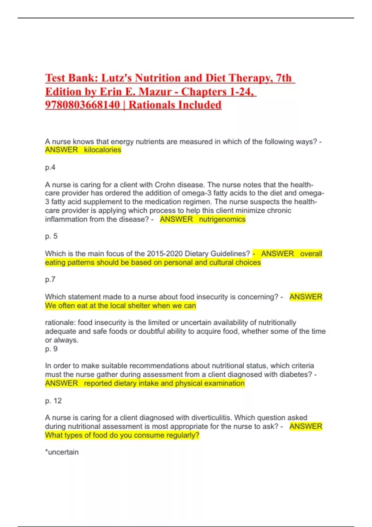 Test Bank: Lutz's Nutrition and Diet Therapy, 7th Edition by Erin E. Mazur - Chapters 1-24,