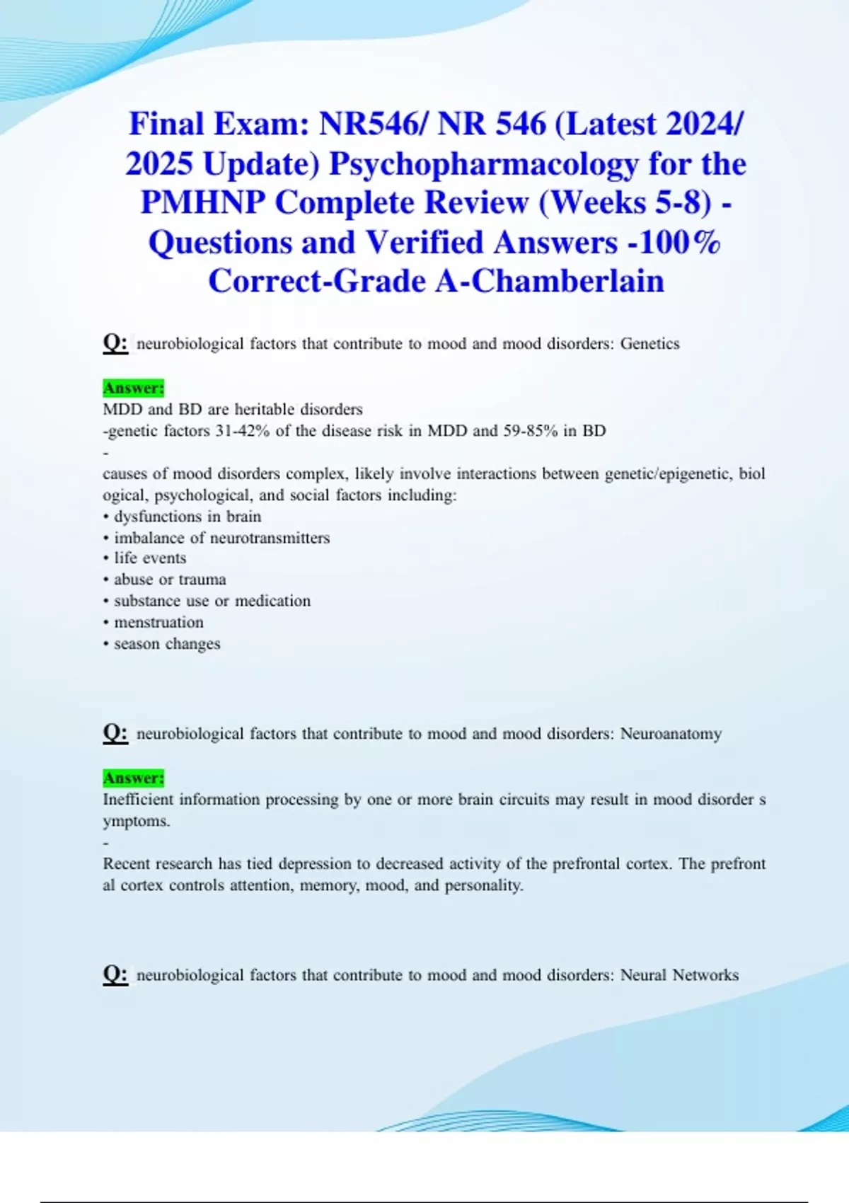 Final Exam: NR546/ NR 546 (Latest 2024/ 2025 Update) Psychopharmacology for the PMHNP Complete Review (Weeks 5-8) -Questions and Verified Answers -100% Correct-Grade A-Chamberlain