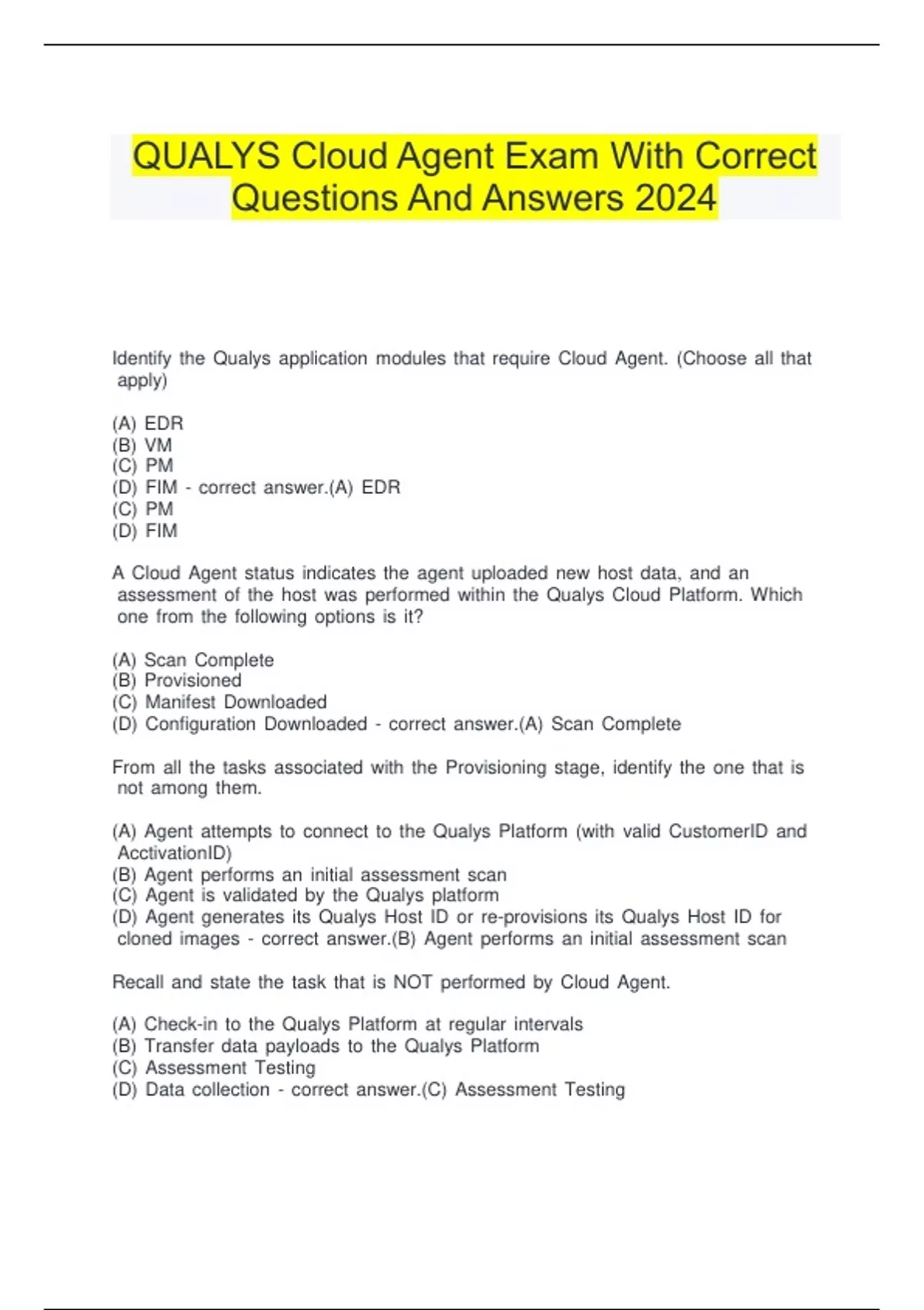 QUALYS Cloud Agent Exam With Correct Questions And Answers 2024