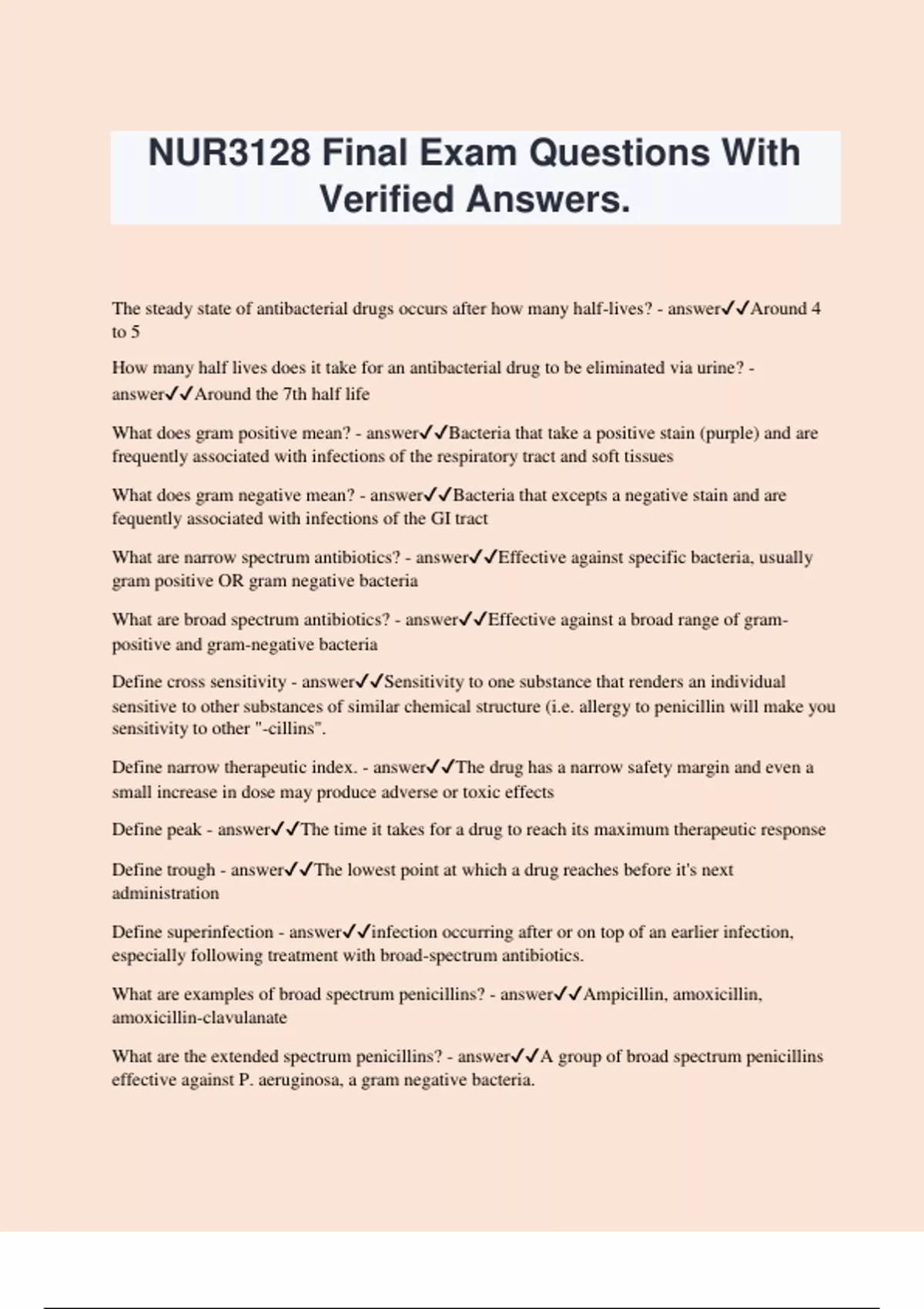 NUR3128 Final Exam Questions With Verified Answers. The steady state of antibacterial drugs occurs after how many half-lives? - answerAround 4 to 5 How many half lives does it take for an antibacterial drug to be eliminated via urine? - answerAround the 7th half life What does gram positive mean? - answerBacteria that take a positive stain (purple) and are frequently associated with infections of the respiratory tract and soft tissues What does gram negative mean? - answerBacteria that excepts a negative stain and are fequently associated with infections of the GI tract What are narrow spectrum antibiotics? - answerEffective against specific bacteria, usually gram positive OR gram negative bacteria What are broad spectrum antibiotics? - answerEffective against a broad range of gram- positive and gram-negative bacteria Define cross sensitivity - answerSensitivity to one substance that renders an individual sensitive to other substances of similar chemical structure (i.e. allergy to penicillin will make you sensitivity to other "-cillins". Define narrow therapeutic index. - answerThe drug has a narrow safety margin and even a small increase in dose may produce adverse or toxic effects Define peak - answerThe time it takes for a drug to reach its maximum therapeutic response Define trough - answerThe lowest point at which a drug reaches before it's next administration Define superinfection - answerinfection occurring after or on top of an earlier infection, especially following treatment with broad-spectrum antibiotics. What are examples of broad spectrum penicillins? - answerAmpicillin, amoxicillin, amoxicillin-clavulanate What are the extended spectrum penicillins? - answerA group of broad spectrum penicillins effective against P. aeruginosa, a gram negative bacteria. What are examples of extended spectrum penicillins? - answerPiperacillin tazobactam What are the beta-lactam antibiotics? - answerA broad spectrum antibiotic is combined with a beta-lactamase enzyme inhibitor, which helps make the antibiotic more effective and extends its effect. What are examples of beta-lactam antibiotics? - answerAztreonam, meropenem What are cephalosporins? - answerA type of antibiotic that is effective against gram negative and gram positive bacteria, as well as resistant to beta-lactamase, so it can easily penetrate bacteria cell walls. What are examples of cephalosporins? - answerCefazolin, Ceftriaxon, Cefuroxime, Cefdinir, Cefepime What is penicillin G used for? - answerStreptococcal infections, such as syphilis, meningitis, endocarditis, pneumonia, serious respiratory infections What is amoxicillin used for? - answerUTI's, sinusitis, otitis, and lower respiratory tract infections What is ampicillin used for? - answerUsed to treat skin infections, soft tissue infections, otitis media (inflammation of middle ear), sinusitis, respiratory infections, meningitis, septicemia What are the adverse reactions to ampicillin? - answerCDAD Diarrhea Rash Seizures (with high doses) Anaphylaxis and serum sickness (allergy) What is amoxicillin-clavulanate used for? - answerTreatment of sinusitis, RTIs, genitourinary tract infections. What are the adverse reactions to amoxicillin-clavulanate? - answerCDAD Diarrhea Rash Seizures (with high doses) Anaphylaxis and serum sickness (allergy) What is the overall desired effect of using anti-infective medications? - answerElimination of infection What is ciprofloxacin used for? - answerAnthrax and some variations of the plague; but also UTIs, lower respiratory tract infections, some forms of gonorrhea. What is vancomycin used for? - answerGram positive severe infections, such as MRSA, enterococci and Clostridium difficile (C-Diff) What adverse reactions are associated with vancomycin? - answerAnaphylaxis and red-man syndrome (occurs with rapid transfusion) What are the Fluroquinolones? - answerA group of broad spectrum antibiotics used for their treatment of UTIs, bone and joint infections, bronchitis, pneumonia, and gastroenteritis. Should be used as last resort antibiotics due to strong adverse reactions. What items should be avoided before or after taking antibiotics? - answerAntacids, milk, iron, alcohol, grapefruit What adverse reactions are associated with fluroquinolones? - answerTendinitis, tendon rupture What tests are done to identify TB infection? - answerTB skin test (PPD), and TB blood test (QuantiFERON) What are antituberculars? - answerDrugs that treat tuberculosis What is latent infection of TB? - answerPeople who harbor TB microorganisms, and may become active later in life. What is active infection of TB? - answerWhen a person is actively infected with TB What are symptoms of TB? - answerAnorexia, productive cough with blood, chest pain, fever, night sweats, weight loss What are prophylactic TB antibiotics? - answerAntitubercular drugs designed to prevent active TB infection in latently infected TB holders. Who is prophylactic treatment recommend for when it comes to TB? - answer· Latent TB infection · Immunocompromised · Positive tuberculin skin test · Positive iGRA results · Converted from negative to positive TB Who should not receive prophylactic TB treatment? - answerThose with liver disease because INH (the primary anti-TB drug used) can damage the liver.