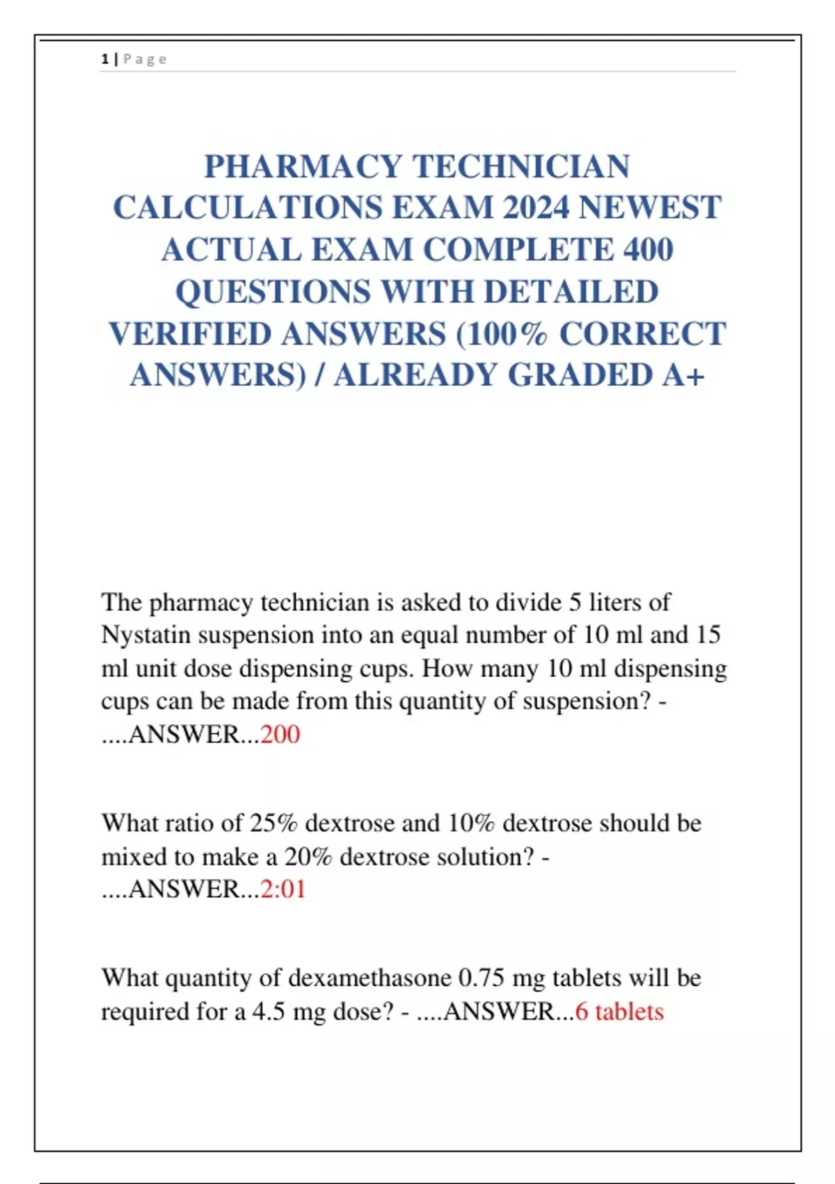 PHARMACY TECHNICIAN CALCULATIONS EXAM 2024 NEWEST ACTUAL EXAM COMPLETE 400 QUESTIONS WITH DETAILED VERIFIED ANSWERS (100% CORRECT ANSWERS) / ALREADY GRADED A+