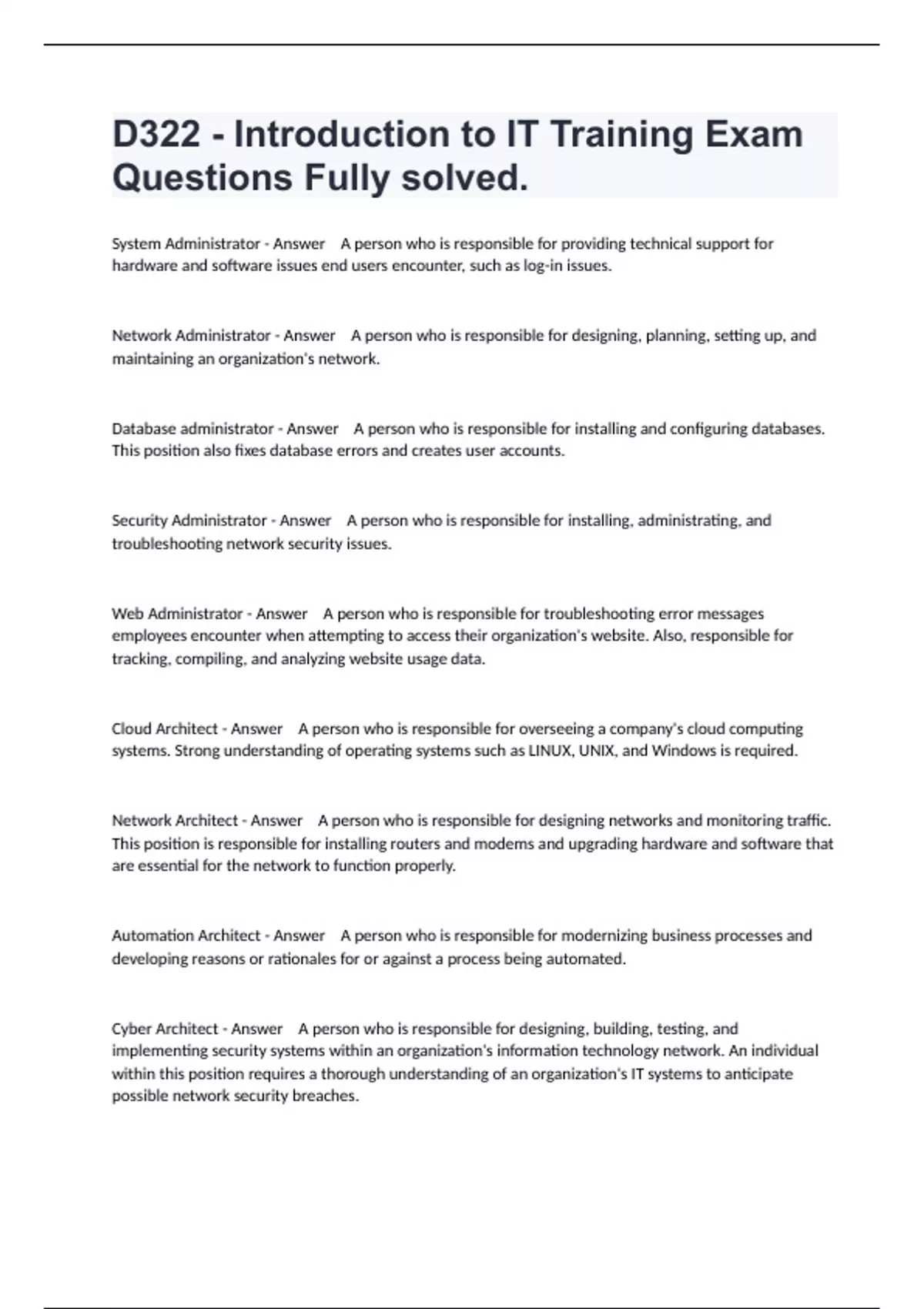 System Administrator - Answer A person who is responsible for providing technical support for hardware and software issues end users encounter, such as log-in issues. Network Administrator - Answer A person who is responsible for designing, planning, setting up, and maintaining an organization's network. Database administrator - Answer A person who is responsible for installing and configuring databases. This position also fixes database errors and creates user accounts. Security Administrator - Answer A person who is responsible for installing, administrating, and troubleshooting network security issues. Web Administrator - Answer A person who is responsible for troubleshooting error messages employees encounter when attempting to access their organization's website. Also, responsible for tracking, compiling, and analyzing website usage data. Cloud Architect - Answer A person who is responsible for overseeing a company's cloud computing systems. Strong understanding of operating systems such as LINUX, UNIX, and Windows is required. Network Architect - Answer A person who is responsible for designing networks and monitoring traffic. This position is responsible for installing routers and modems and upgrading hardware and software that are essential for the network to function properly. Automation Architect - Answer A person who is responsible for modernizing business processes and developing reasons or rationales for or against a process being automated. Cyber Architect - Answer A person who is responsible for designing, building, testing, and implementing security systems within an organization's information technology network. An individual within this position requires a thorough understanding of an organization's IT systems to anticipate possible network security breaches.