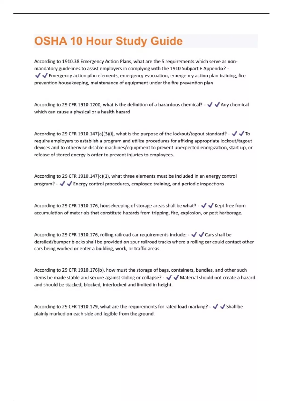 According to 1910.38 Emergency Action Plans, what are the 5 requirements which serve as nonmandatory guidelines to assist employers in complying with the 1910 Subpart E Appendix? - Emergency action plan elements, emergency evacuation, emergency action plan training, fire prevention housekeeping, maintenance of equipment under the fire prevention plan According to 29 CFR 1910.1200, what is the definition of a hazardous chemical? - Any chemical which can cause a physical or a health hazard According to 29 CFR 1910.147(a)(3)(i), what is the purpose of the lockout/tagout standard? - To require employers to establish a program and utilize procedures for affixing appropriate lockout/tagout devices and to otherwise disable machines/equipment to prevent unexpected energization, start up, or release of stored energy is order to prevent injuries to employees. According to 29 CFR 1910.147(c)(1), what three elements must be included in an energy control program? - Energy control procedures, employee training, and periodic inspections According to 29 CFR 1910.176, housekeeping of storage areas shall be what? - Kept free from accumulation of materials that constitute hazards from tripping, fire, explosion, or pest harborage. According to 29 CFR 1910.176, rolling railroad car requirements include: - Cars shall be derailed/bumper blocks shall be provided on spur railroad tracks where a rolling car could contact other cars being worked or enter a building, work, or traffic areas. According to 29 CFR 1910.176(b), how must the storage of bags, containers, bundles, and other such items be made stable and secure against sliding or collapse? - Material should not create a hazard and should be stacked, blocked, interlocked and limited in height. According to 29 CFR 1910.179, what are the requirements for rated load marking? - Shall be plainly marked on each side and legible from the ground.According to 29 CFR 1910.184, what is the definition of a choker hitch? - A sling configuration with one end of the sling passing under the load and through an end attachment, handle, or eye on the other end of the sling According to 29 CFR 1910.184, what is the definition of a sling? - An assembly which connects the load to the material handling equipment