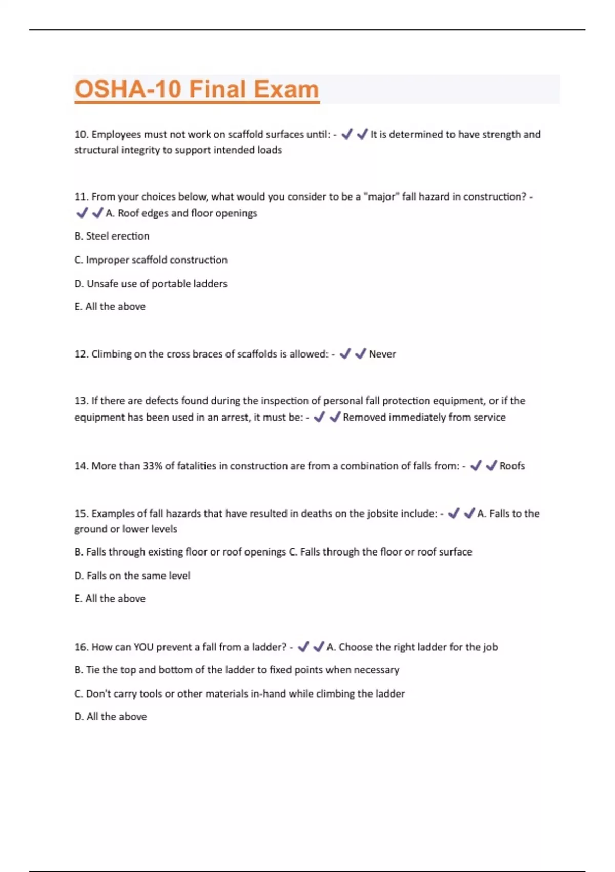 10. Employees must not work on scaffold surfaces until: - It is determined to have strength and structural integrity to support intended loads 11. From your choices below, what would you consider to be a "major" fall hazard in construction? - A. Roof edges and floor openings B. Steel erection C. Improper scaffold construction D. Unsafe use of portable ladders E. All the above 12. Climbing on the cross braces of scaffolds is allowed: - Never 13. If there are defects found during the inspection of personal fall protection equipment, or if the equipment has been used in an arrest, it must be: - Removed immediately from service 14. More than 33% of fatalities in construction are from a combination of falls from: - Roofs 15. Examples of fall hazards that have resulted in deaths on the jobsite include: - A. Falls to the ground or lower levels B. Falls through existing floor or roof openings C. Falls through the floor or roof surface D. Falls on the same level E. All the above 16. How can YOU prevent a fall from a ladder? - A. Choose the right ladder for the job B. Tie the top and bottom of the ladder to fixed points when necessary C. Don't carry tools or other materials in-hand while climbing the ladder D. All the above17. Three major components of a Personal Fall Arrest System (PFAS) include; anchor and the anchorage connector; full body harness; and: - Connecting device (lanyard with shock absorber/retractable lifeline, snap hooks) 18. When using scaffolds, make sure there is which of the following? - A. Safe and compliant access and egress B. Full planking C. Stable footing D. Guard railing E. All of the above 19. Preventing fall hazards is a critical part of the construction planning process. Controls to mitigate fall hazards include installing which of the following? - A. Guardrails B. Walls C. Protective covers D. Parapets E. All of the above 20. OSHA requires fall protection at different heights for construction and general industry however, regardless of the fall distance, which of the following is most correct? - A. Fall protection must be provided when working over dangerous equipment B. Fall protection must be provided when working over dangerous machinery C. Both A and B are correct D. None of the above 21. D-rings and snap-hooks must have a minimum tensile strength of: - 5,000 pounds 22. Horizontal lifelines shall be designed, installed, and used under the supervision of a _______ as part of a complete personal fall arrest system, which maintains a safety factor of at least two. - Qualified Person23. Preventing fall hazards is a critical part of the construction planning process. Controls to mitigate fall hazards include installing which of the following? - A. Guardrails B. Walls C. Protective covers D. Parapets E. All of the above