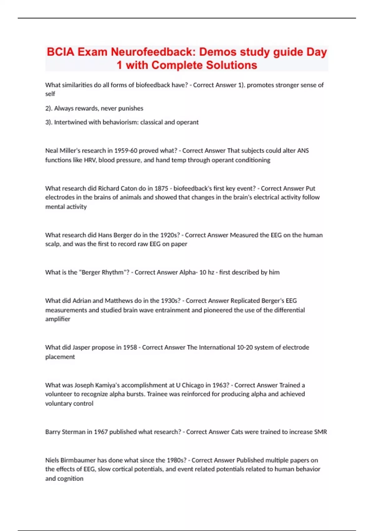 BCIA Exam Neurofeedback: Demos study guide Day 1 with Complete Solutions What similarities do all forms of biofeedback have? - Correct Answer 1). promotes stronger sense of self 2). Always rewards, never punishes 3). Intertwined with behaviorism: classical and operant Neal Miller's research in 1959-60 proved what? - Correct Answer That subjects could alter ANS functions like HRV, blood pressure, and hand temp through operant conditioning What research did Richard Caton do in 1875 - biofeedback's first key event? - Correct Answer Put electrodes in the brains of animals and showed that changes in the brain's electrical activity follow mental activity What research did Hans Berger do in the 1920s? - Correct Answer Measured the EEG on the human scalp, and was the first to record raw EEG on paper What is the "Berger Rhythm"? - Correct Answer Alpha- 10 hz - first described by him What did Adrian and Matthews do in the 1930s? - Correct Answer Replicated Berger's EEG measurements and studied brain wave entrainment and pioneered the use of the differential amplifier What did Jasper propose in 1958 - Correct Answer The International 10-20 system of electrode placement What was Joseph Kamiya's accomplishment at U Chicago in 1963? - Correct Answer Trained a volunteer to recognize alpha bursts. Trainee was reinforced for producing alpha and achieved voluntary control Barry Sterman in 1967 published what research? - Correct Answer Cats were trained to increase SMR Niels Birmbaumer has done what since the 1980s? - Correct Answer Published multiple papers on the effects of EEG, slow cortical potentials, and event related potentials related to human behavior and cognition