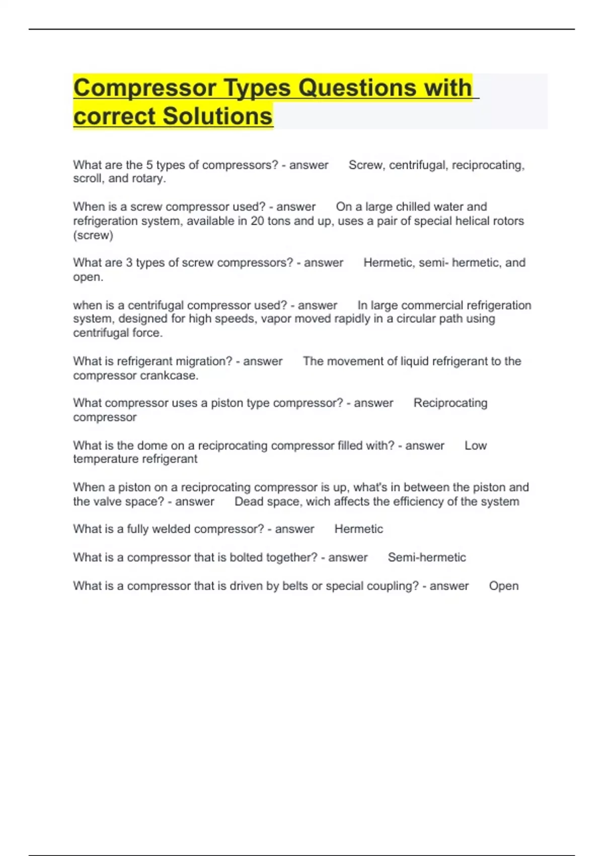 Compressor Types Questions with correct Solutions What are the 5 types of compressors? Screw, centrifugal, reciprocating, scroll, and rotary. When is a screw compressor used? On a large chilled water and refrigeration system, available in 20 tons and up, uses a pair of special helical rotors (screw) What are 3 types of screw compressors? Hermetic, semi- hermetic, and open. when is a centrifugal compressor used? In large commercial refrigeration system, designed for high speeds, vapor moved rapidly in a circular path using centrifugal force. What is refrigerant migration? The movement of liquid refrigerant to the compressor crankcase. What compressor uses a piston type compressor? Reciprocating compressor What is the dome on a reciprocating compressor filled with? Low temperature refrigerant When a piston on a reciprocating compressor is up, what's in between the piston and the valve space? Dead space, wich affects the efficiency of the system