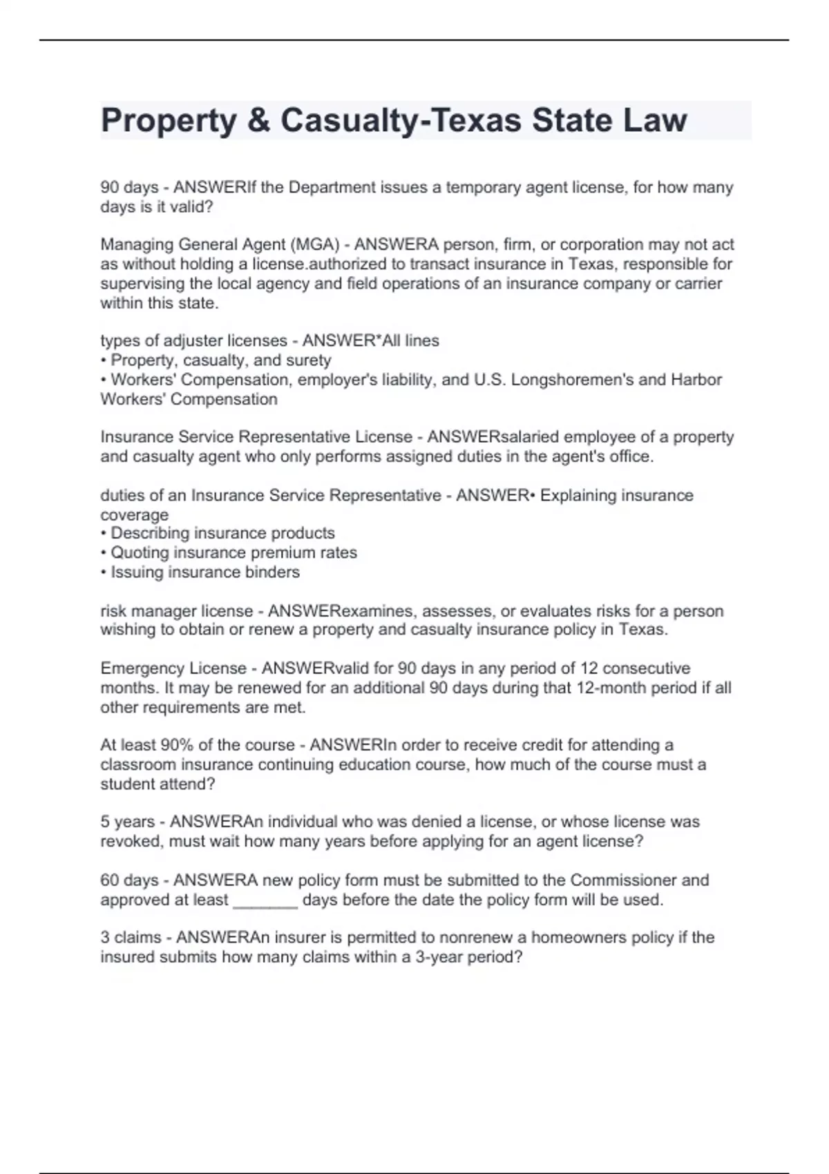 Property & Casualty-Texas State Law.Actual questions and answers graded 100%