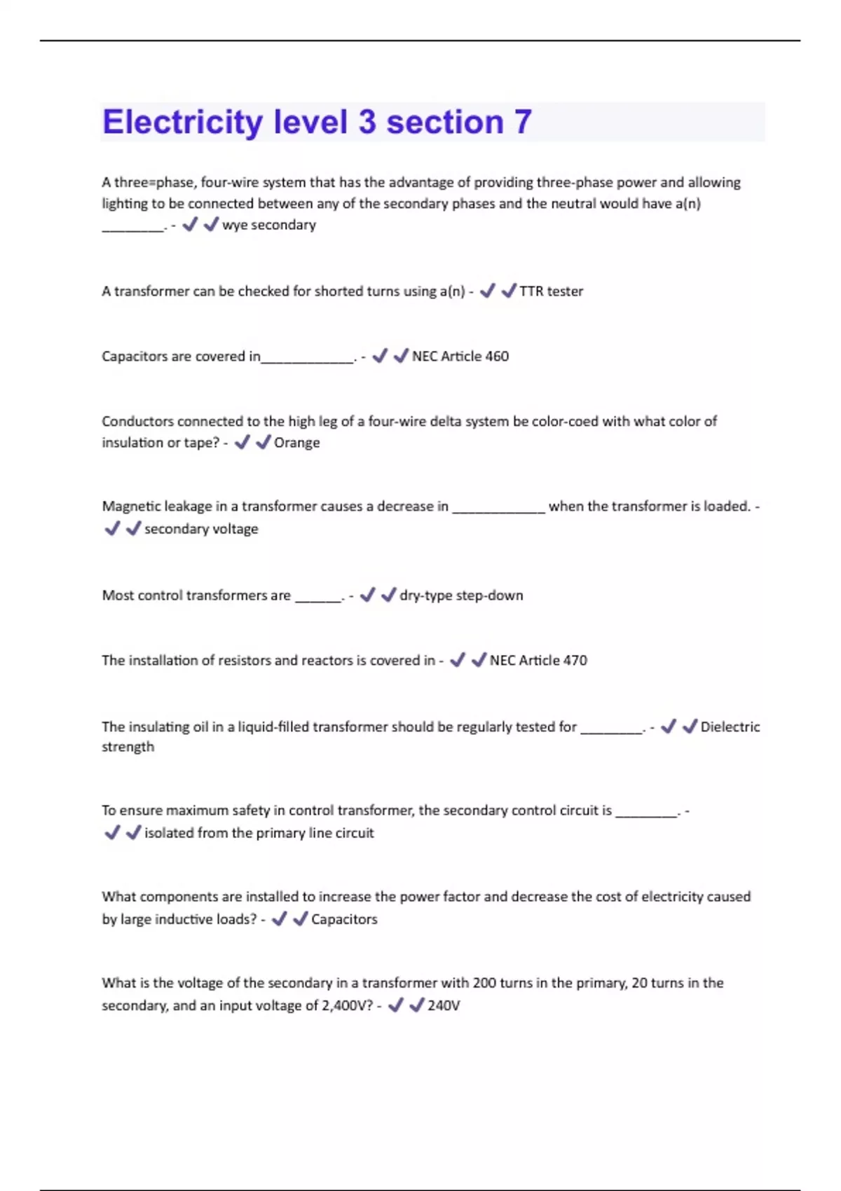 Electricity level 3 section 7 Questions and Answers 2024 ,2025 Fully Solved 100%