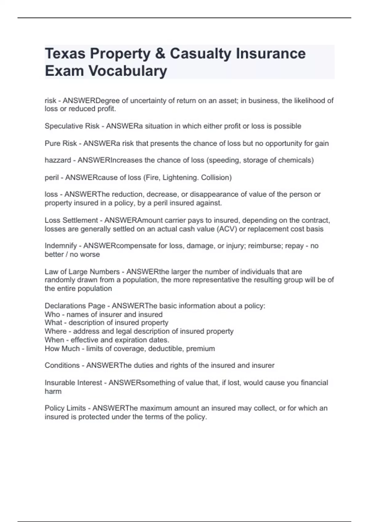 Texas Property & Casualty Insurance Exam Vocabulary.