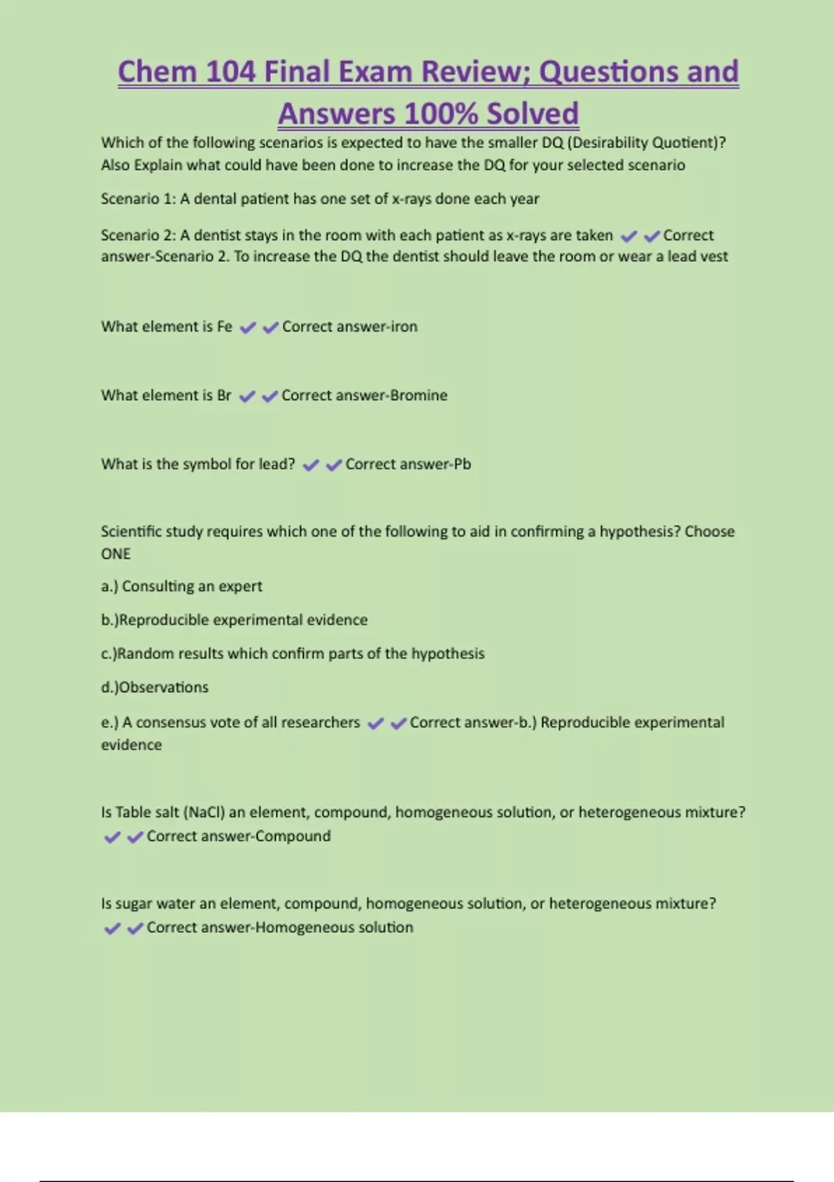 Chem 104 Final Exam Review; Questions and Answers 100% Solved Which of the following scenarios is expected to have the smaller DQ (Desirability Quotient)? Also Explain what could have been done to increase the DQ for your selected scenario Scenario 1: A dental patient has one set of x-rays done each year Scenario 2: A dentist stays in the room with each patient as x-rays are taken Correct answer-Scenario 2. To increase the DQ the dentist should leave the room or wear a lead vest What element is Fe Correct answer-iron What element is Br Correct answer-Bromine What is the symbol for lead? Correct answer-Pb